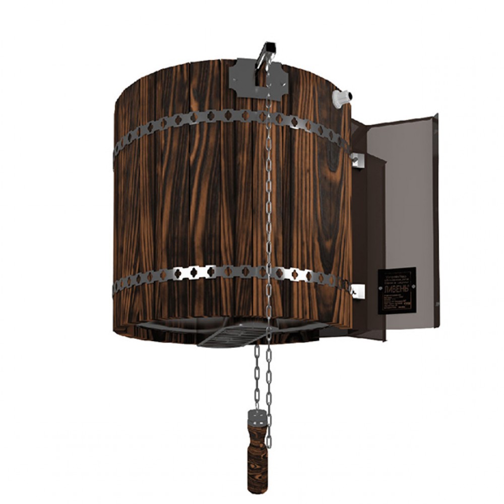 У обычных обливных ведер объем воды составляет 10-12 литров, что явно недостаточно для эффективного и единовременного охлаждения тела. В результате возникает дисбаланс между разогретыми и охлажденными его участками. В обливном устройстве «Ливень» Мини запас воды составляет 36 литров, что эффективно позволяет охладить тело после самого интенсивного парения. Специальный рассекатель формирует поток изливающейся воды таким образом, чтобы полностью охватить тело человека и охладить его.