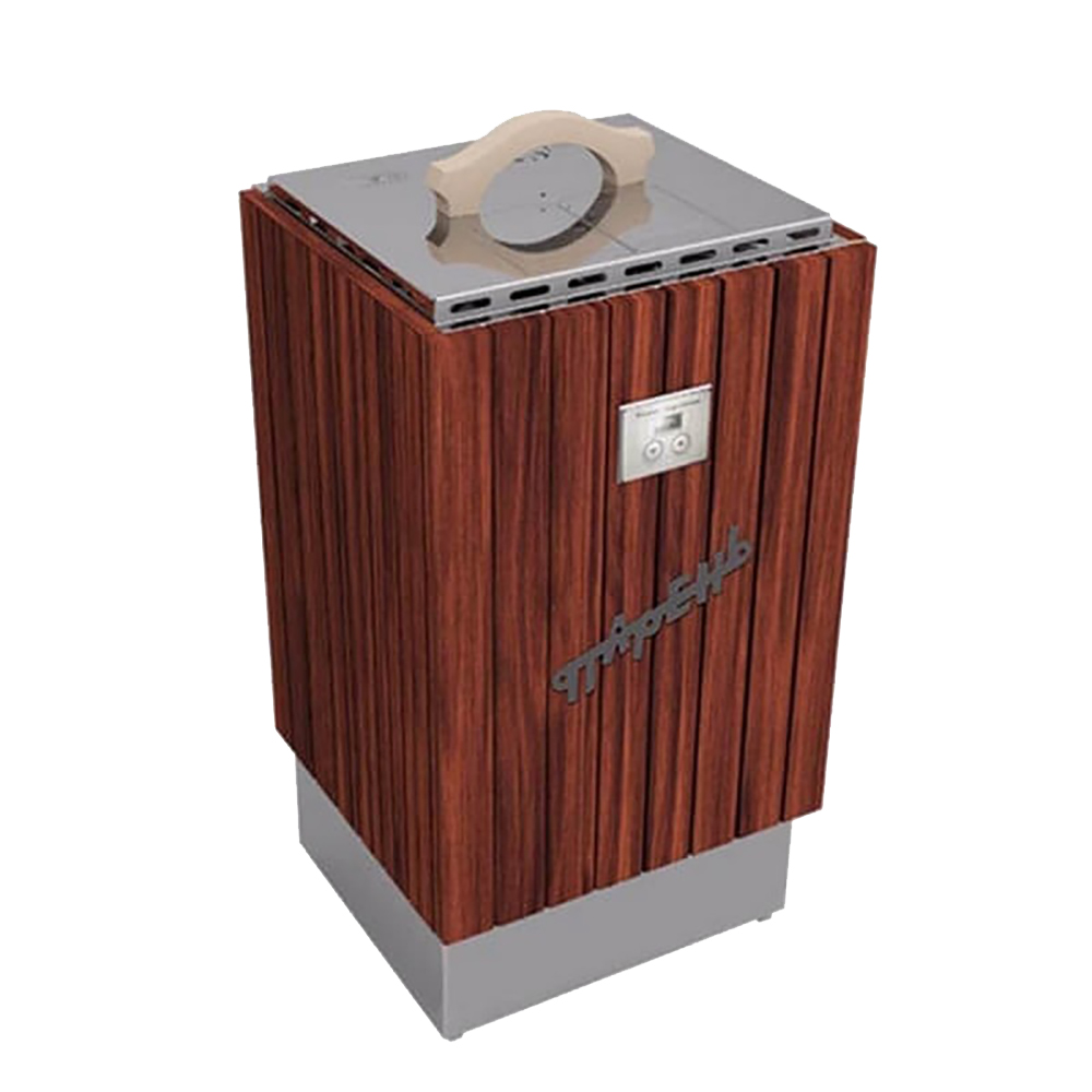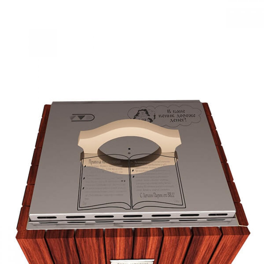 Запарник изготавливается в двух габаритных исполнениях (мм.): 345х345х530 и 330х250х530 из коррозионностойкой нержавеющей стали толщиной: корпус и крышка – 0,5 мм., дно и верхняя рамка – 1 мм.Корпус оформлен декоративными деревянными планками в цвете – либо «красное дерево», либо «сосна», которые одновременно являются и защитным и теплоизолирующим материалом. В середину дна впаян сливной медный патрубок диаметром 15 мм, закрывающийся специальной силиконовой пробочкой. На дне изделия находится перфорированная решетка, препятствующая погружению веников в воду.