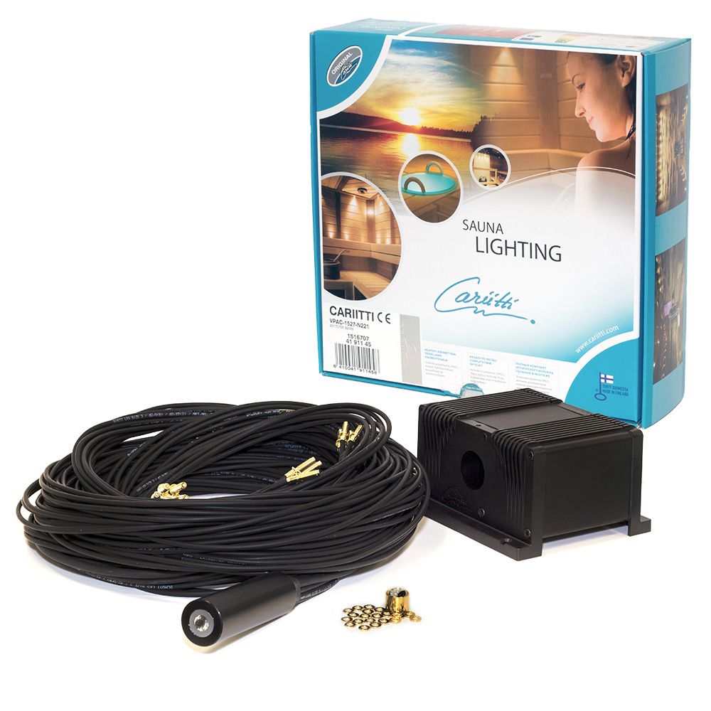 Комплект отлично подходит для освещения саун малого и среднего размера. Волокна устанавливаются в полках и подспиннике, а также в потолке.