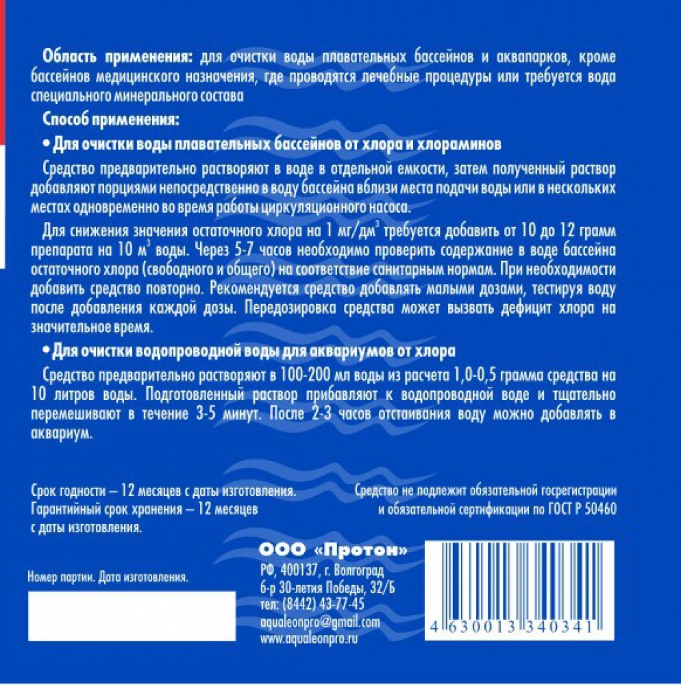 Средство для очистки воды плавательных бассейнов от избыточного хлора.
