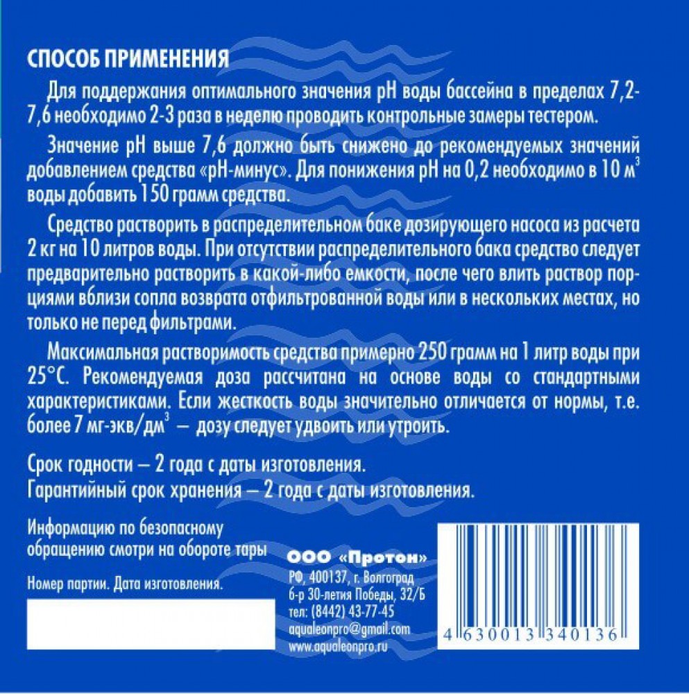 Оптимальное значение pH воды в бассейне лежит в пределах от 7,2 до 7,6. Повышение уровня pH вызывает раздражение слизистой оболочки, снижает естественную защиту кожи, вода известкуется, появляется запах хлора. Кроме того, повышение рН резко снижает эффективность действия дезинфицирующих средств. Для понижения до оптимального уровня pH применяют регулятор pH-минус.