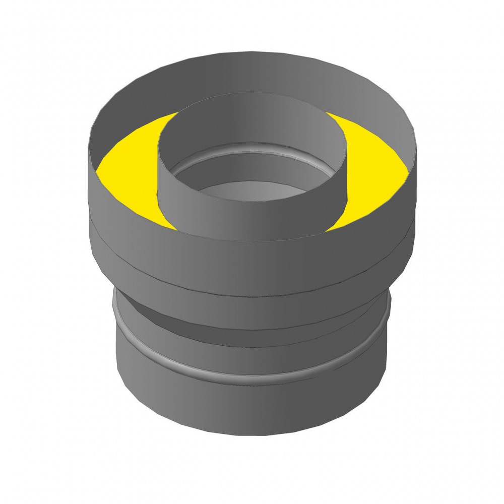 Переход на больший (меньший) диаметр служит для изменения площади сечения дымового канала в большую (меньшую) сторону, Двустенные переходы чаще встречаются в дымотрубных системах, в связи с подключением нескольких отопительных устройств в единую дымовую трубу, таким образом на горизонтальном участке дымохода при сведении двух труб в одну необходимо подключиться к большему диаметру основного участка дымохода.