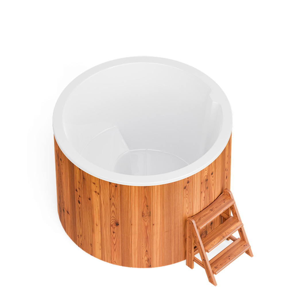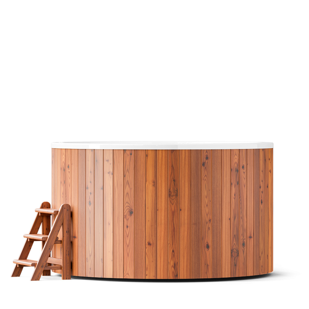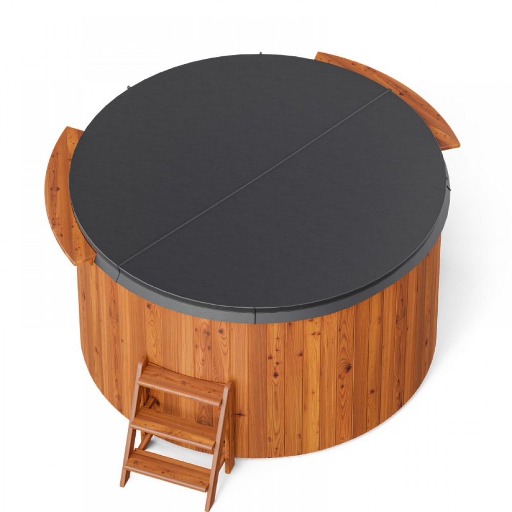Отделка купели выполнена ламелями из термососны. Древесина предварительно подвергся температурной обработке в специальных условиях, что придаёт её устойчивость к воздействиям окружающей среды, стабильность (сохранение формы), прочность, долговечность и красивый внешний вид. Дополнительно термососна пропитываются специально разработанным составом на алкидной основе, который обеспечивает высокую защиту от влаги, гниения, плесени и грибков.