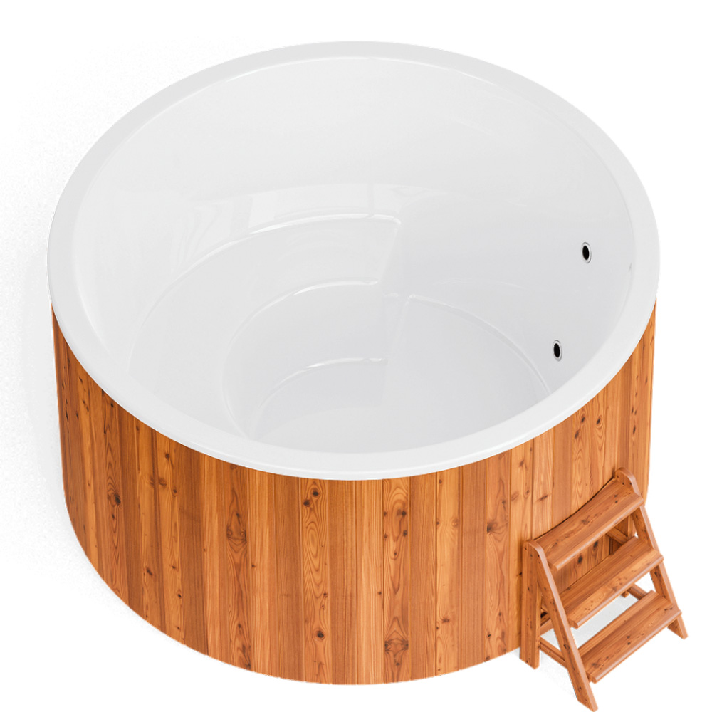Отделка купели выполнена ламелями из термососны. Древесина предварительно подвергся температурной обработке в специальных условиях, что придаёт её устойчивость к воздействиям окружающей среды, стабильность (сохранение формы), прочность, долговечность и красивый внешний вид. Дополнительно термососна пропитываются специально разработанным составом на алкидной основе, который обеспечивает высокую защиту от влаги, гниения, плесени и грибков.