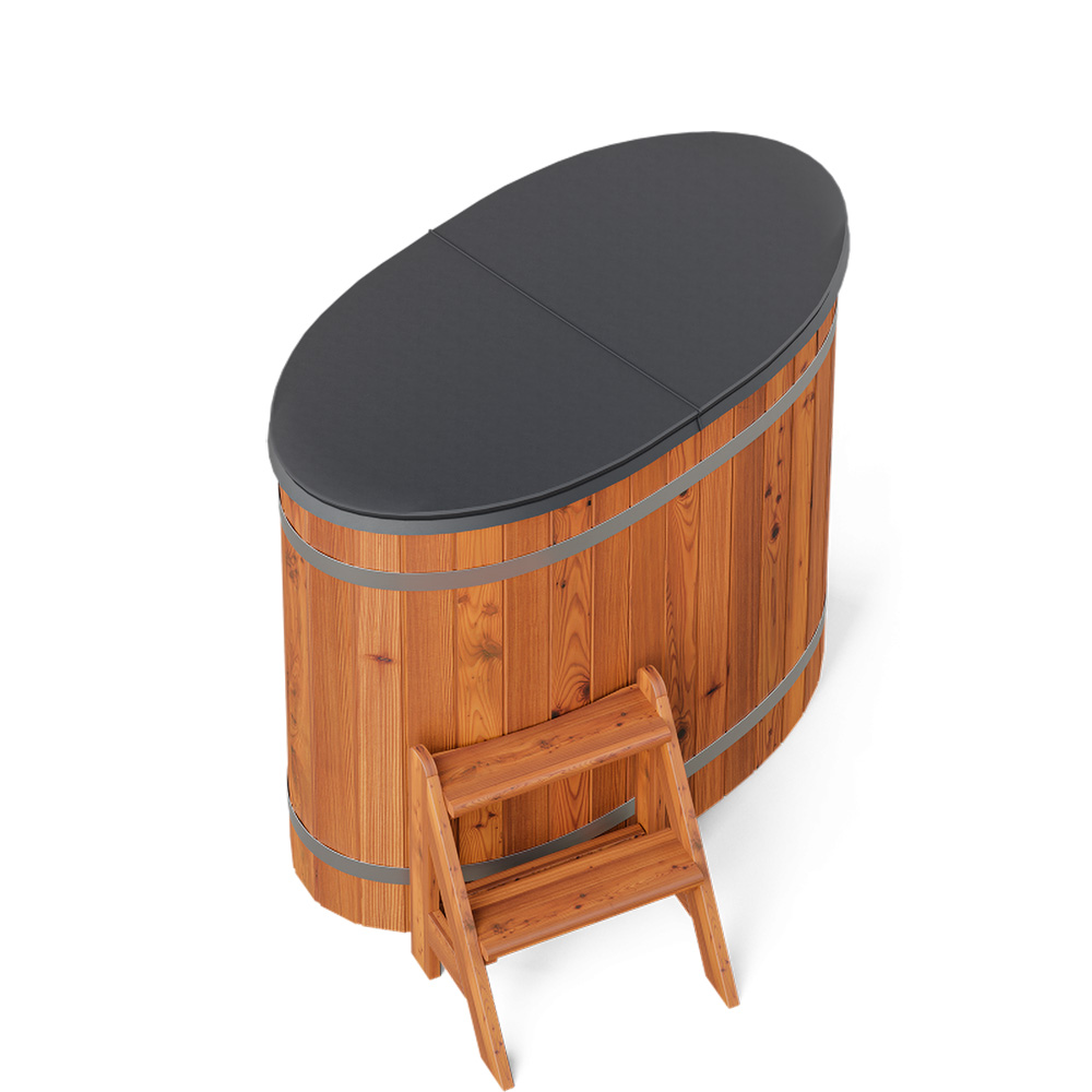 Отделка купели выполнена ламелями из термососны. Древесина предварительно подвергся температурной обработке в специальных условиях, что придаёт её устойчивость к воздействиям окружающей среды, стабильность (сохранение формы), прочность, долговечность и красивый внешний вид. Дополнительно термососны пропитываются специально разработанным составом на алкидной основе, который обеспечивает высокую защиту от влаги, гниения, плесени и грибков.