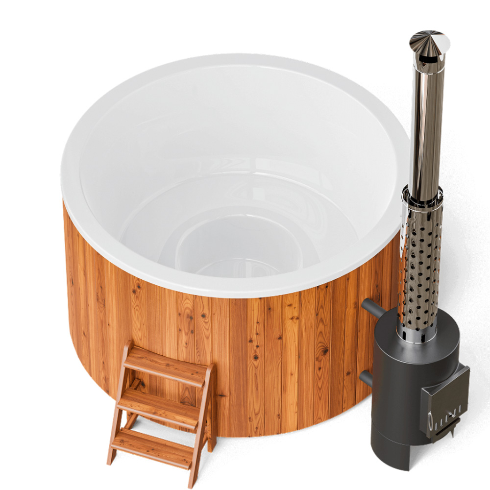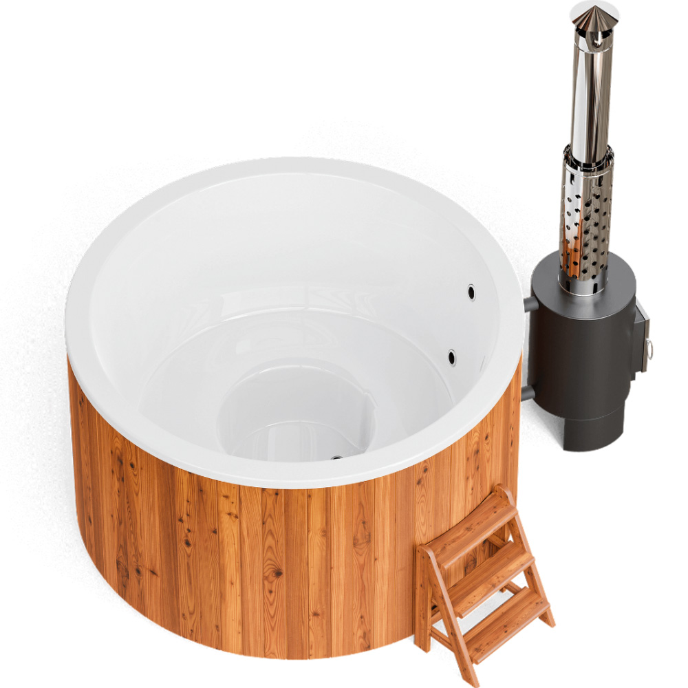 Интегрированная в чашу купели печь из пищевой нержавеющей стали обеспечит максимально быстрый нагрев, удобную закладку дров, а установленное в дверце печи жаропрочное стекло позволит не только контролировать процесс горения, но и создаст дополнительный уют и романтику. Дымоход имеет специальный экран из нержавеющей зеркальной стали, что гарантирует защиту от возможных ожогов. Эстетичный краник слива купели расположен в удобном месте и может использоваться также для наполнения купели.