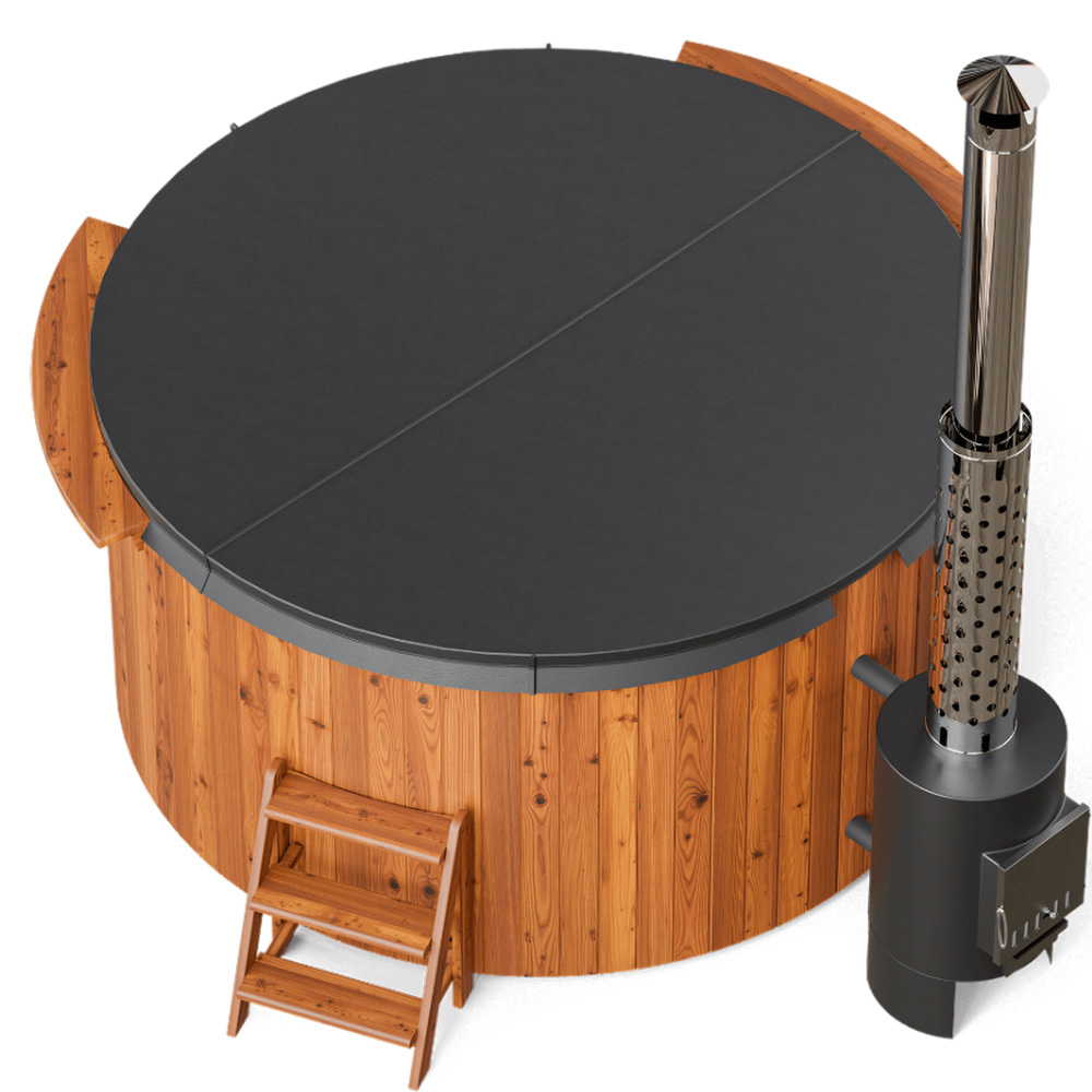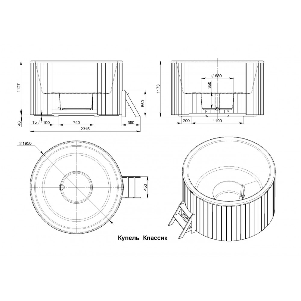 Комплект поставки | купель; дровяная печь 40 кВт; дымоход из стали (Д140хВ200 мм) с зонтиком; металлический сливной механизм; приставная лесенка на три ступеньки; технический паспорт с инструкцией |
