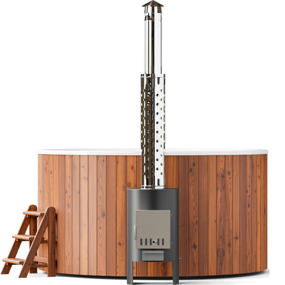 Комплект поставки | купель; дровяная печь 40 кВт; дымоход из стали (Д140хВ200 мм) с зонтиком; металлический сливной механизм; приставная лесенка на две ступеньки; технический паспорт с инструкцией |