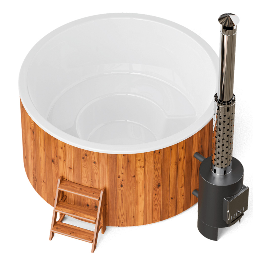 Интегрированная в чашу купели печь из пищевой нержавеющей стали обеспечит максимально быстрый нагрев, удобную закладку дров, а установленное в дверце печи жаропрочное стекло позволит не только контролировать процесс горения, но и создаст дополнительный уют и романтику. Дымоход имеет специальный экран из нержавеющей зеркальной стали, что гарантирует защиту от возможных ожогов. Эстетичный краник слива купели расположен в удобном месте и может использоваться также для наполнения купели.