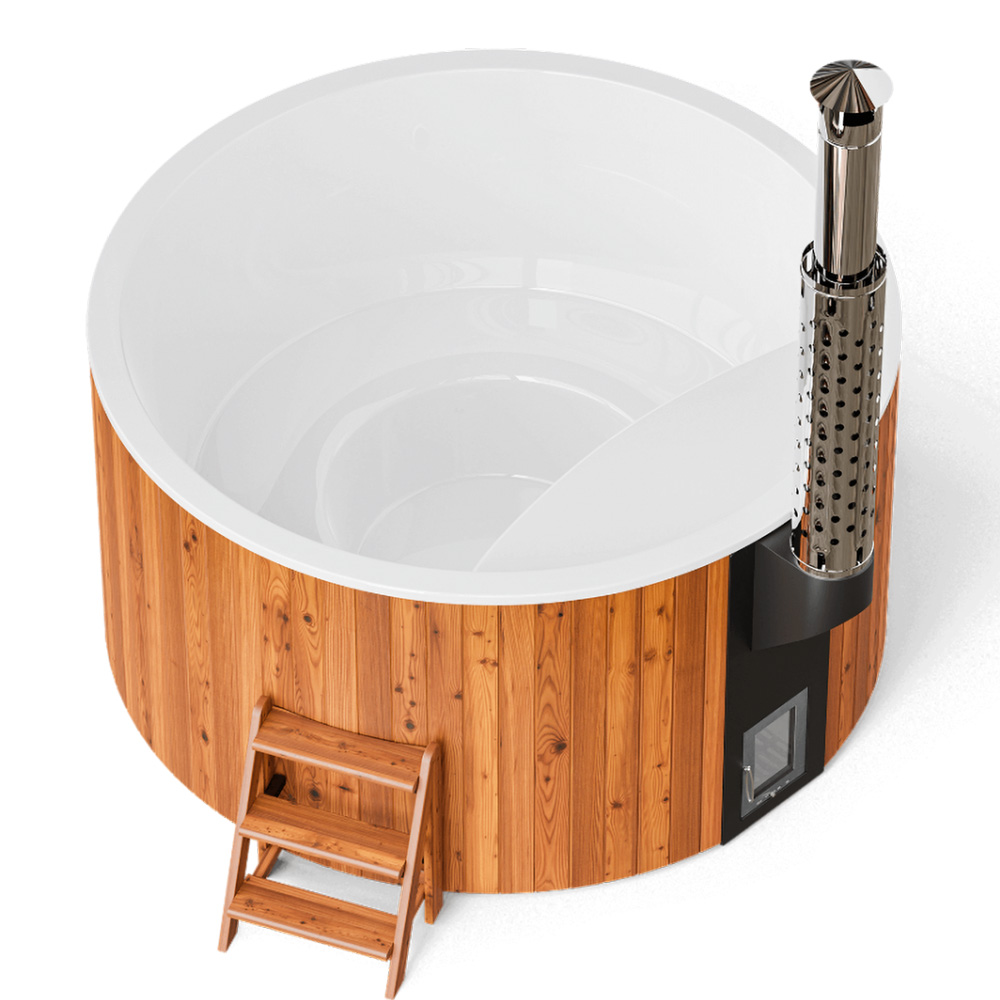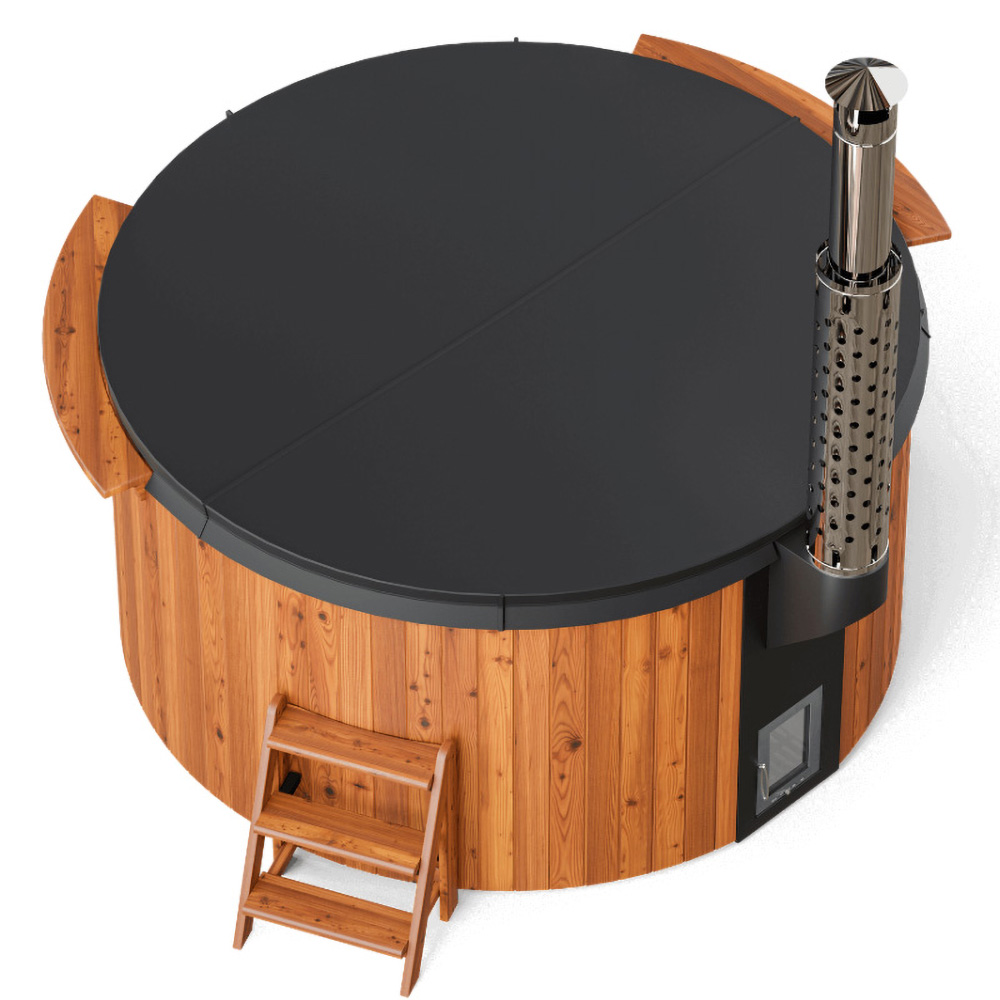 Интегрированная в чашу купели печь из пищевой нержавеющей стали обеспечит максимально быстрый нагрев, удобную закладку дров, а установленное в дверце печи жаропрочное стекло позволит не только контролировать процесс горения, но и создаст дополнительный уют и романтику. Дымоход имеет специальный экран из нержавеющей зеркальной стали, что гарантирует защиту от возможных ожогов. Эстетичный краник слива купели расположен в удобном месте и может использоваться также для наполнения купели.