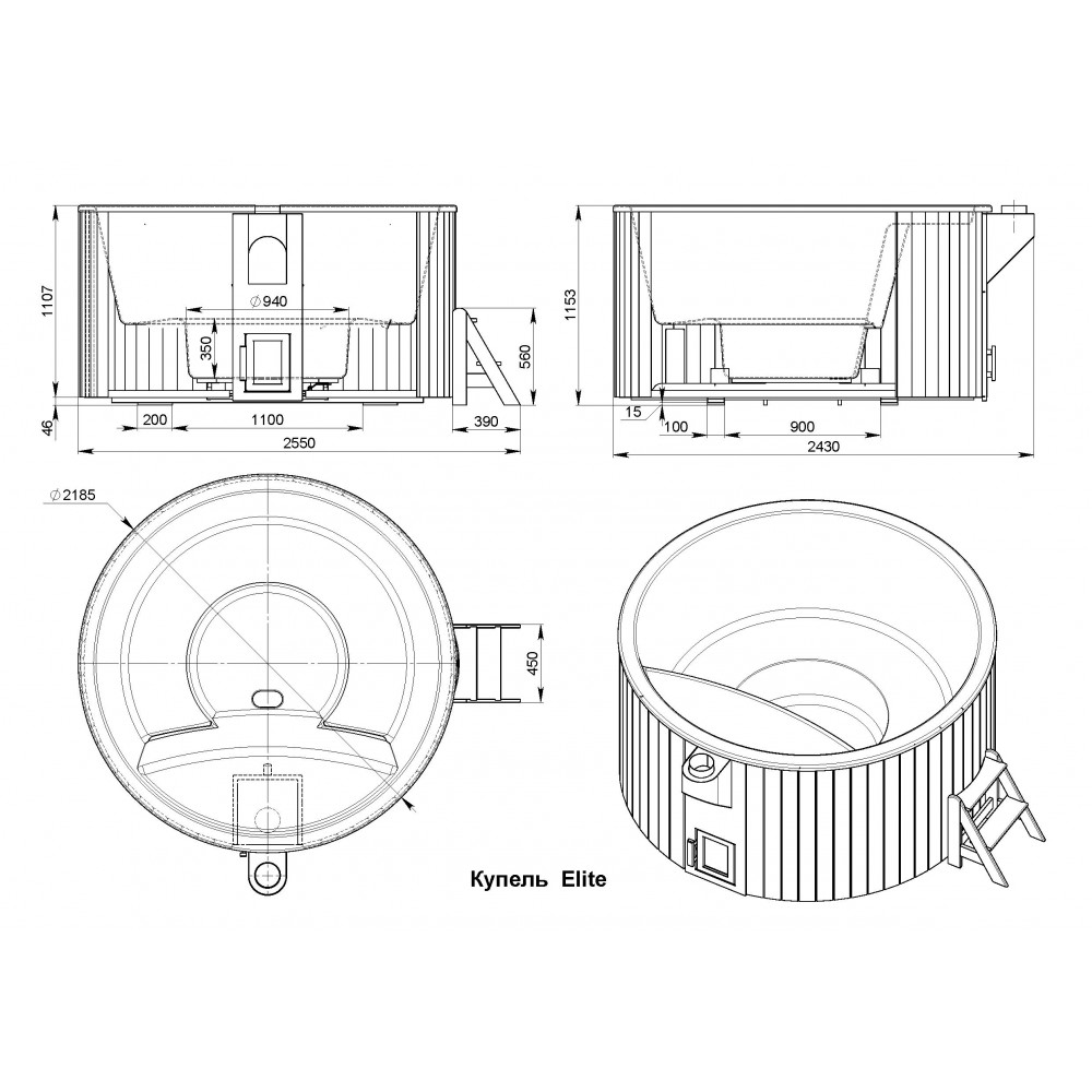 Комплект поставки | купель со встроенной дровяной печью; дымоход с защитным экраном и зонтиком; металлический сливной механизм; приставная лесенка на две ступеньки; технический паспорт с инструкцией |