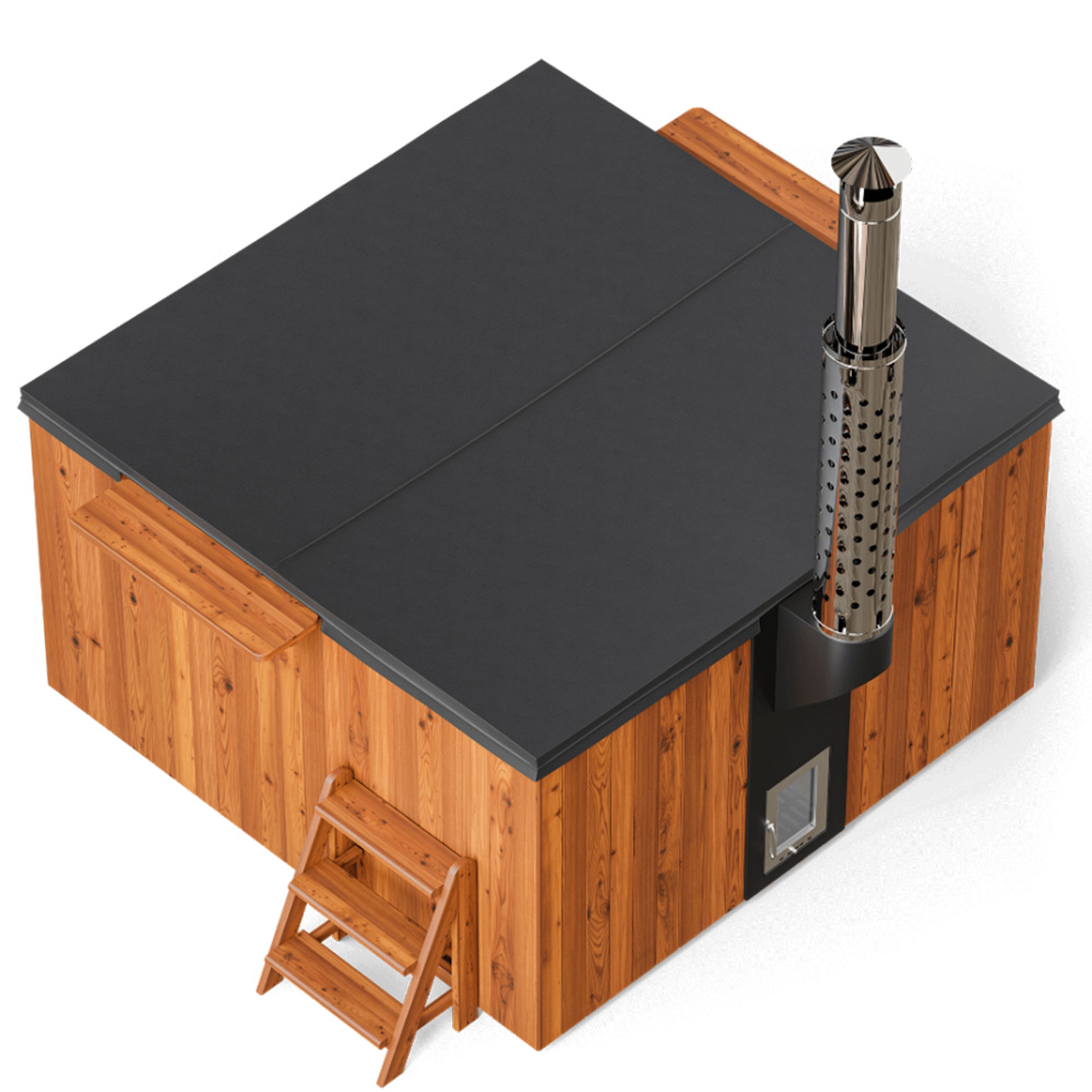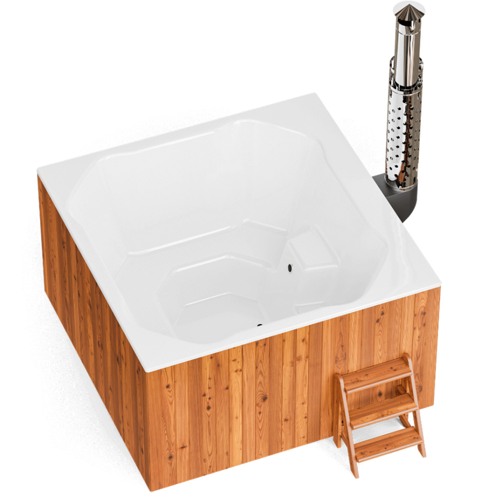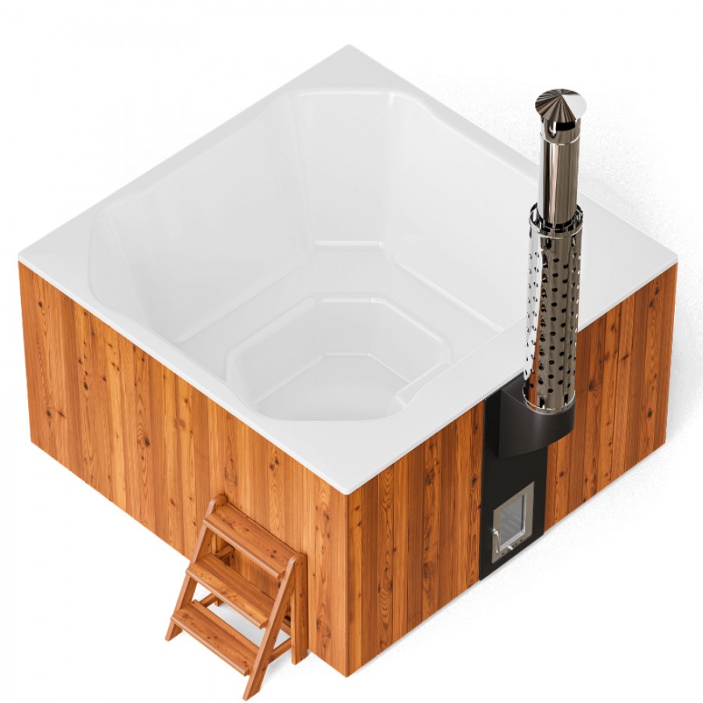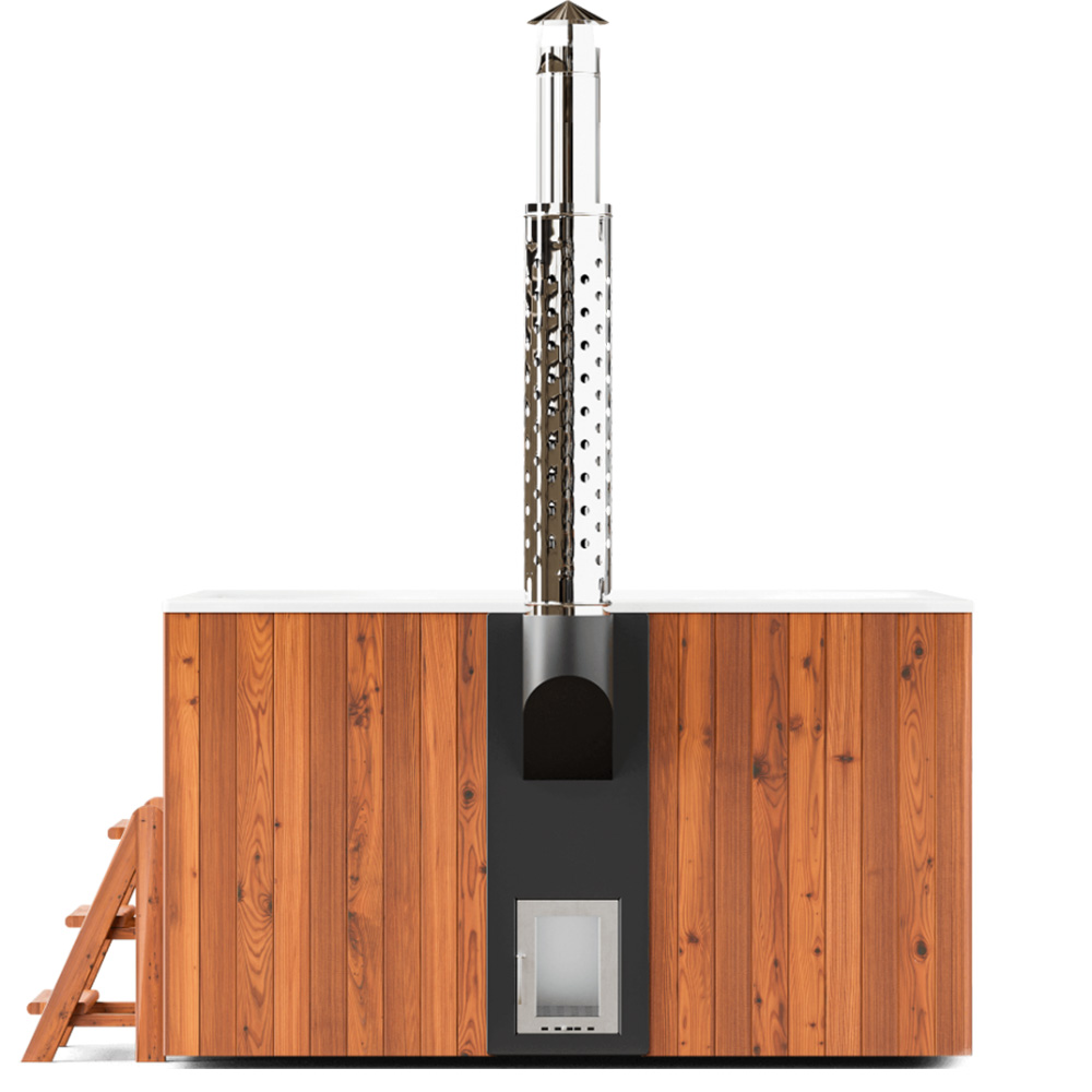 Интегрированная в чашу купели печь из пищевой нержавеющей стали обеспечит максимально быстрый нагрев, удобную закладку дров, а установленное в дверце печи жаропрочное стекло позволит не только контролировать процесс горения, но и создаст дополнительный уют и романтику. Дымоход имеет специальный экран из нержавеющей зеркальной стали, что гарантирует защиту от возможных ожогов. Эстетичный краник слива купели расположен в удобном месте и может использоваться также для наполнения купели.