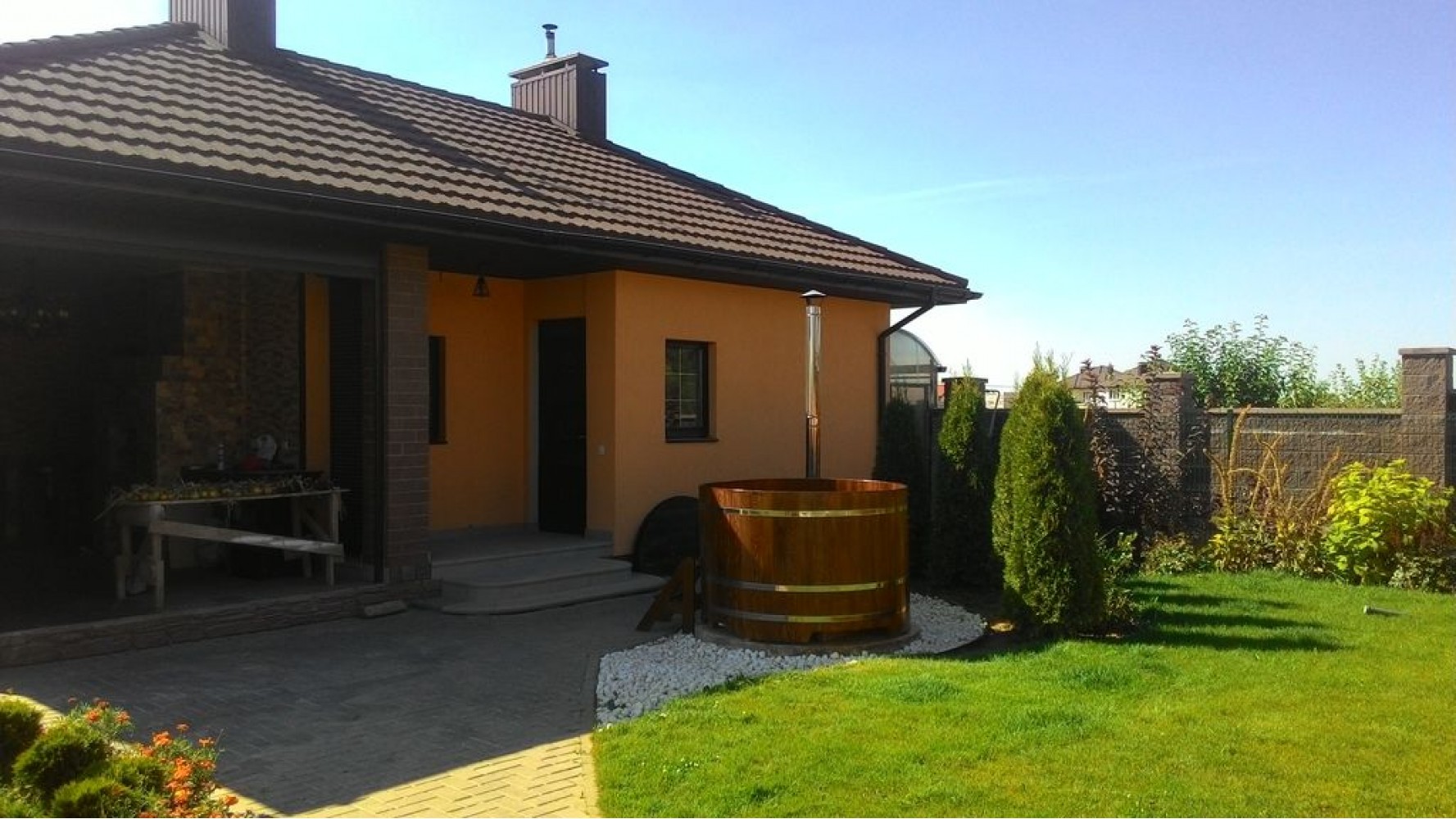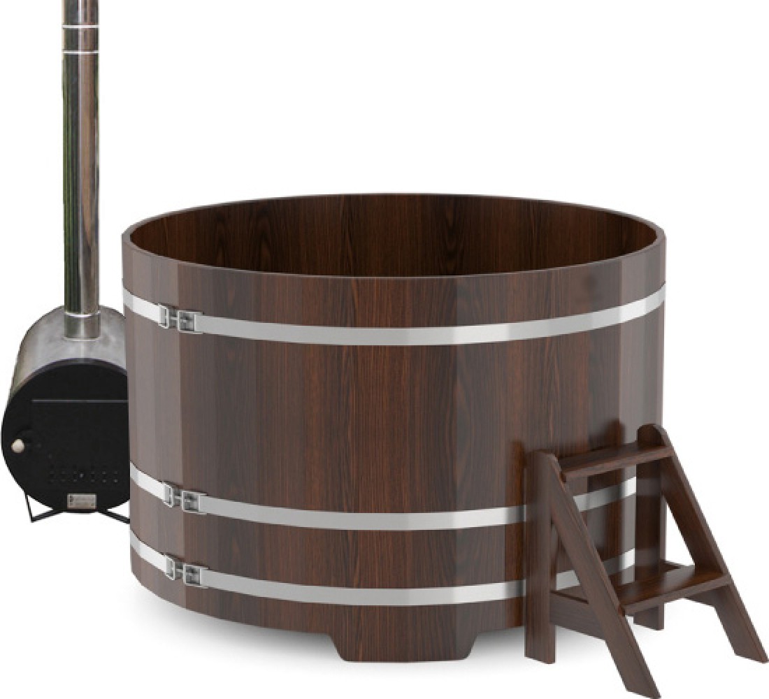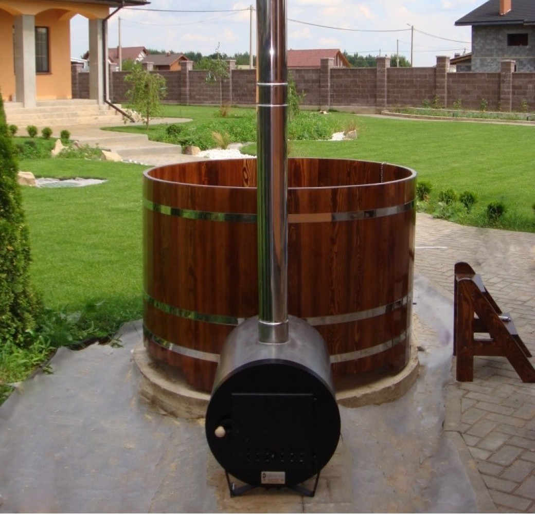 Комплектация: купель из лиственницы диаметром 150 см, высота 110 см, два сиденья, лесенка наружная, сливной механизм с пробкой, печь наружная 25 кВт из нержавеющей стали, дымоход для печи с зонтиком.