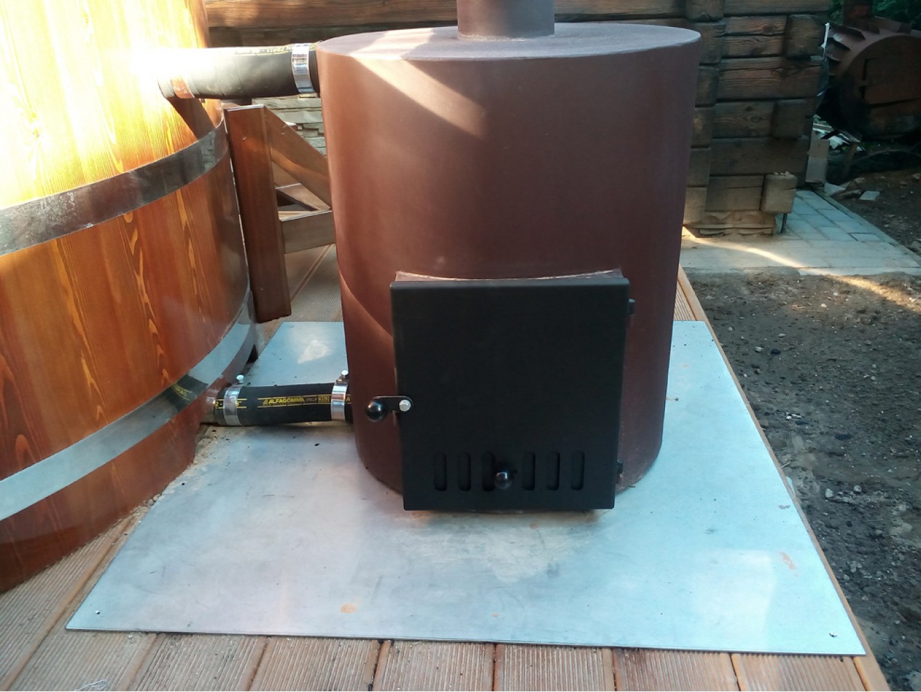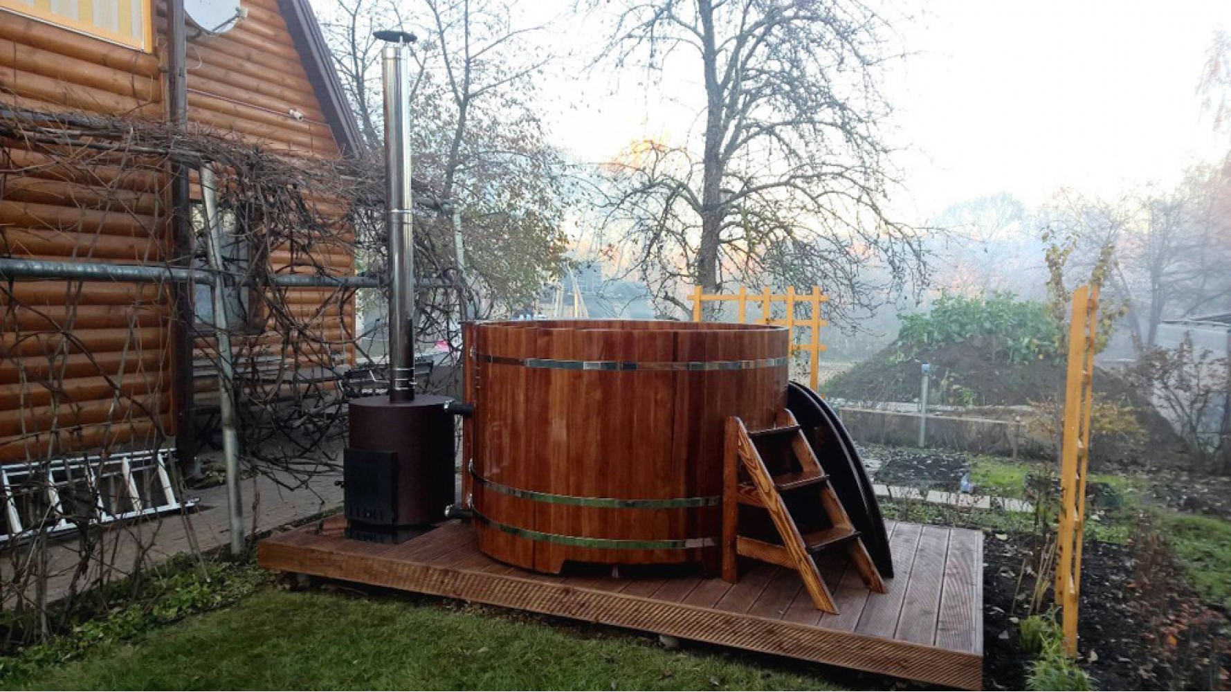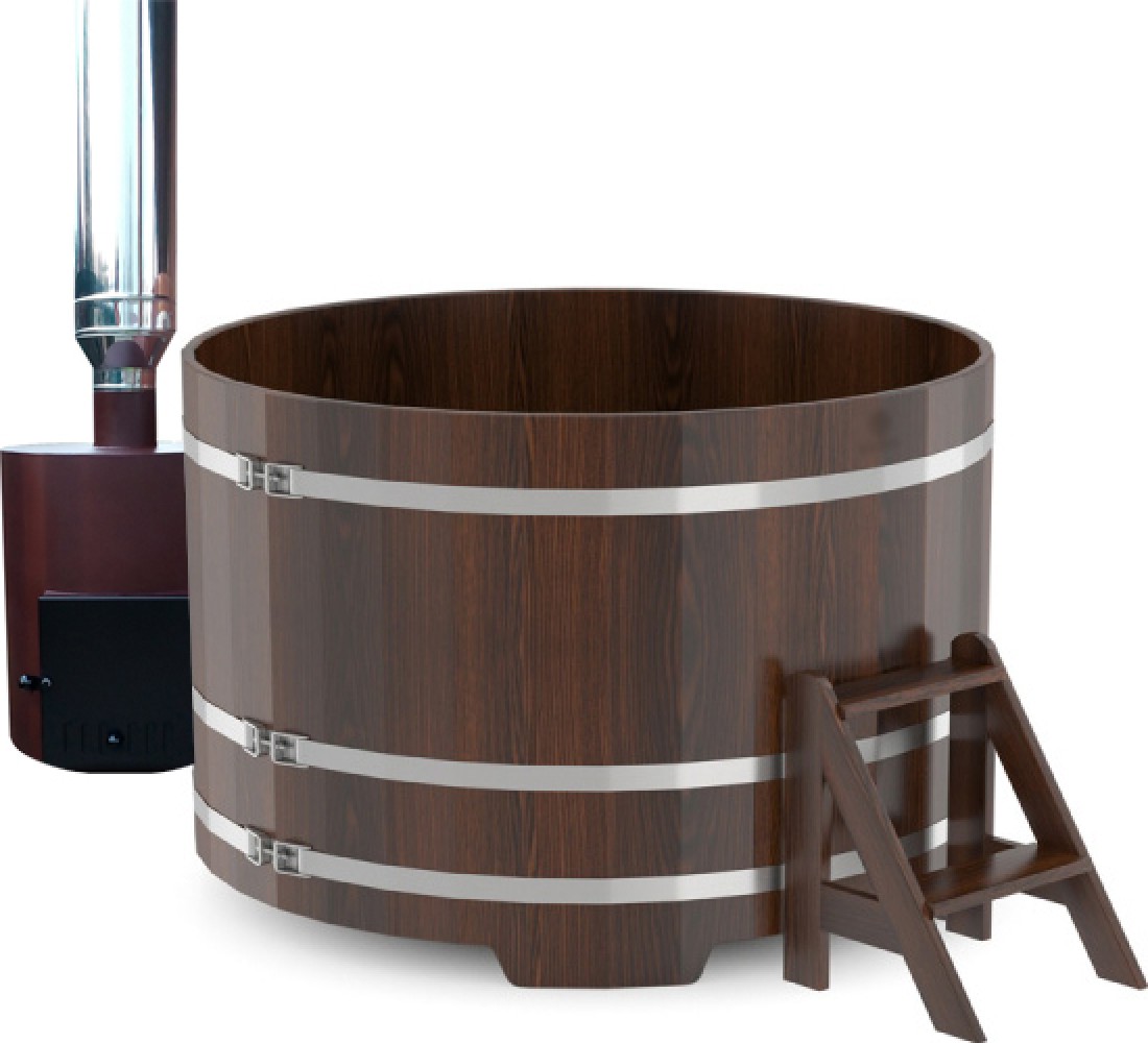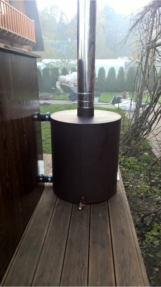 Комплектация: купель из лиственницы диаметром 180 см, высота 110 см, два сиденья, лесенка наружная, сливной механизм с пробкой, печь наружная 45 кВт из нержавеющей стали, дымоход для печи с зонтиком.