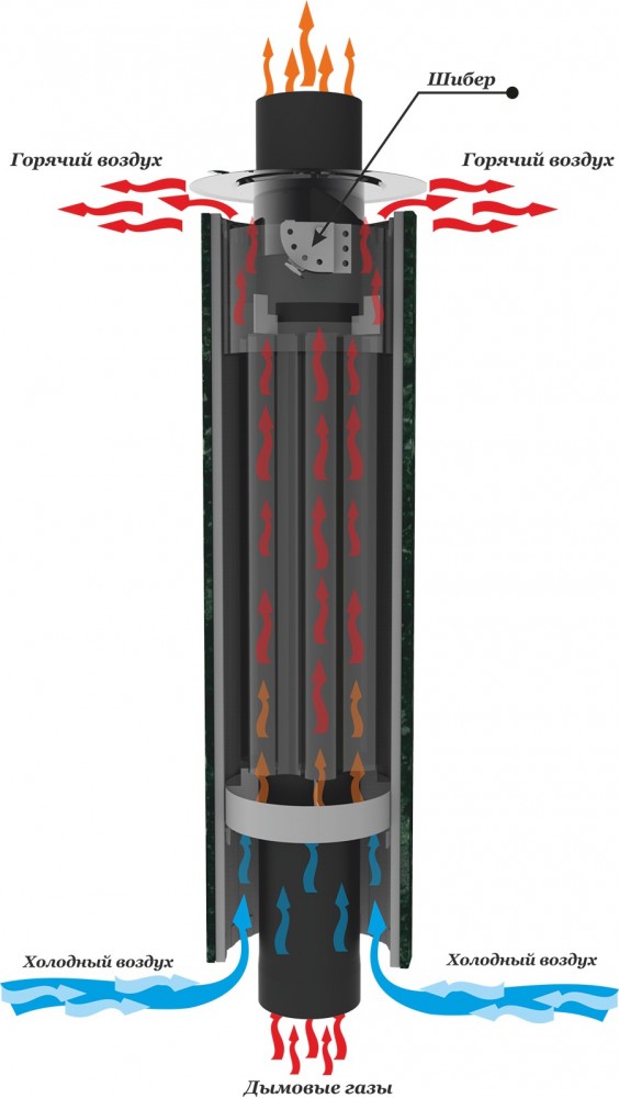 Дымоход-конвектор - элемент дымохода, одетый в Ламели из полированного, природного камня, с регулируемой конвекцией. Используется для повышения КПД печи за счет конвекции воздуха в помещении. Конвекция осуществляется через заданные каналы за счет регулируемой циркуляции воздуха. Возможность регулировки прогрева парной. В комплекте идёт регулятор тяги, а так же в дымоходе есть регулятор конвекционного воздуха. Монтируется сразу на печь.
