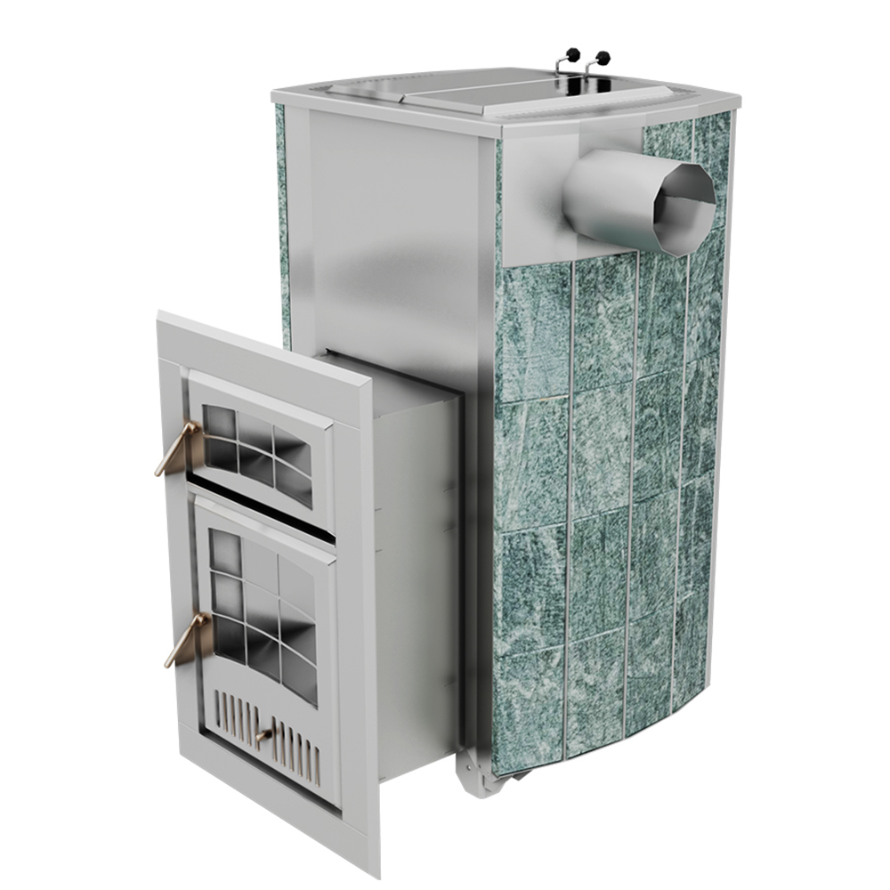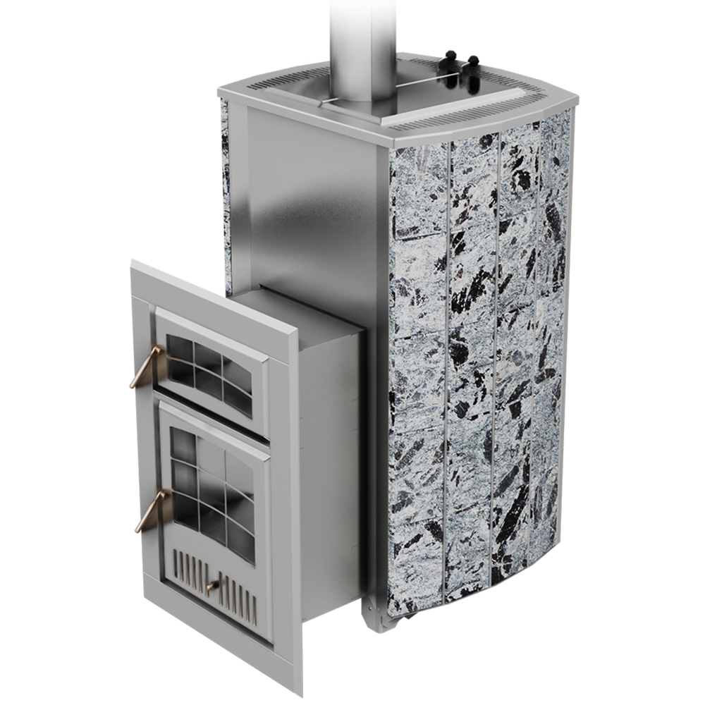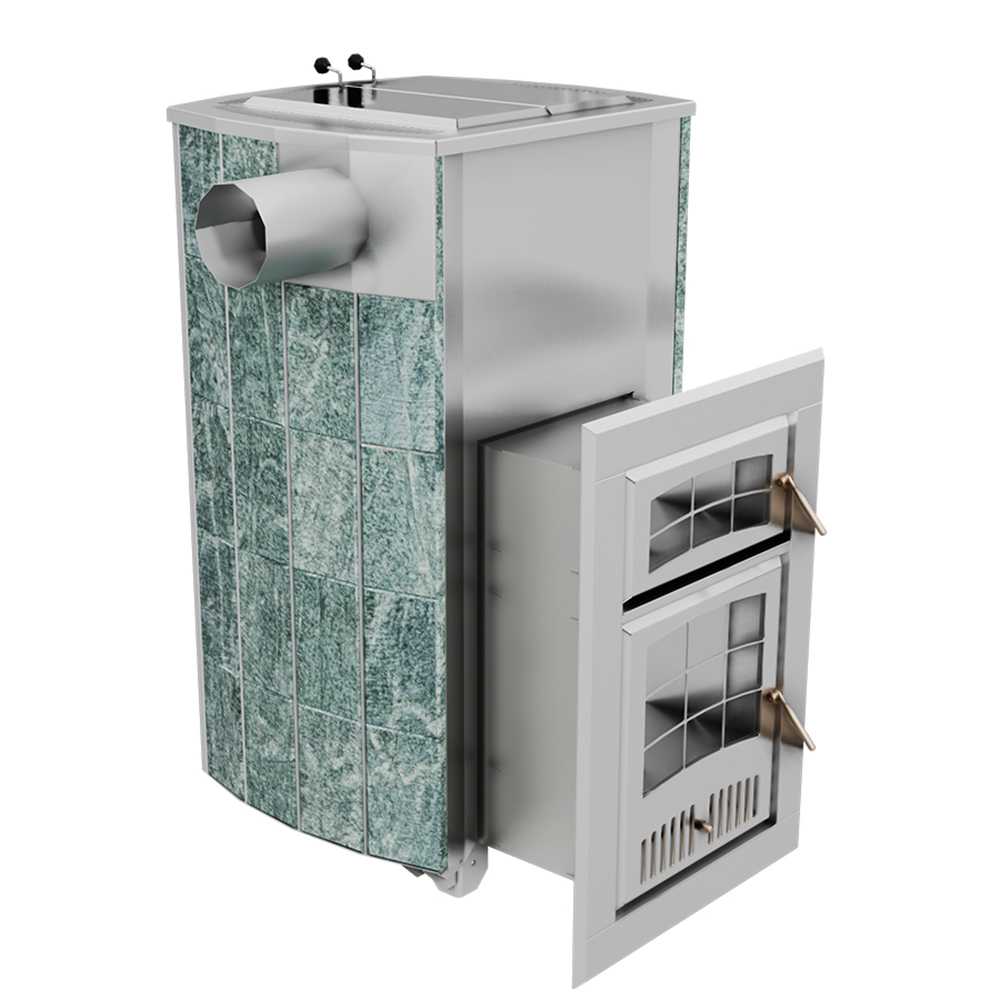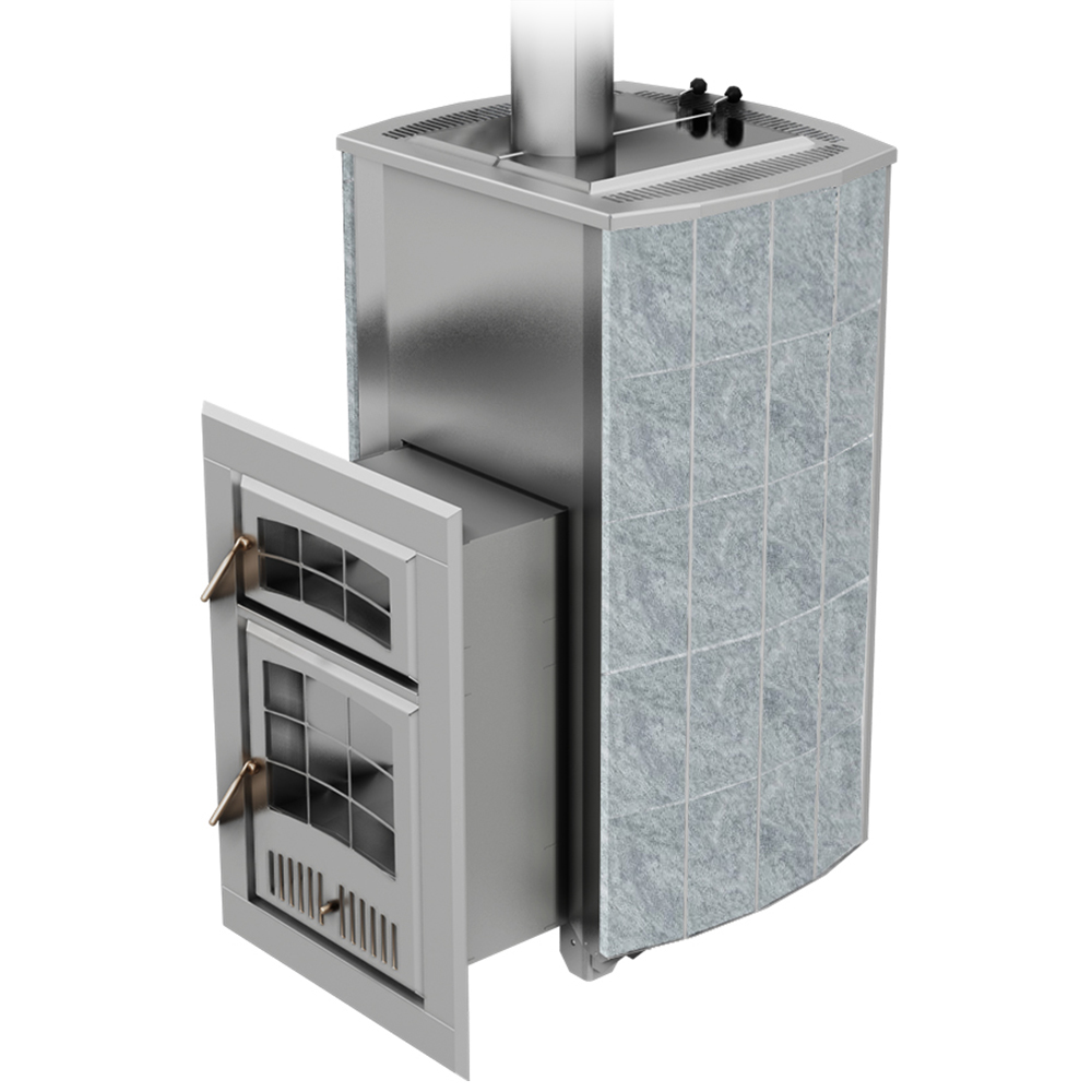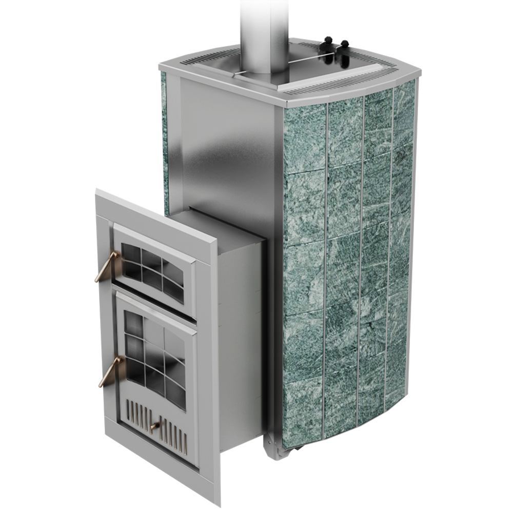 Внешний контур печи - массивная каменная облицовка, выполнена из природного камня серпентинита, талькохлорита или змеевика. Является одновременно и экраном от жесткого инфракрасного излучения, и стенкой конвекционного канала между нею и топочным агрегатом. Наличие этого канала сделало печь «быстрой» на изначальный разогрев парного помещения и всей бани в целом.