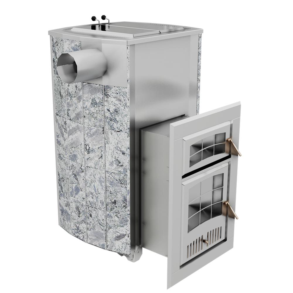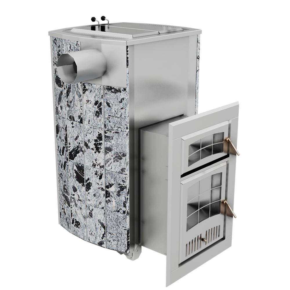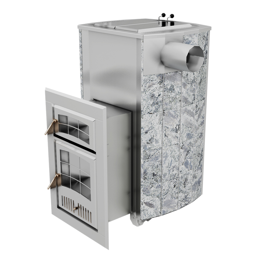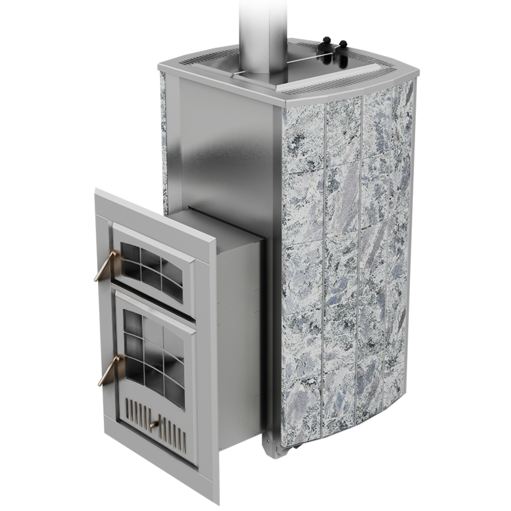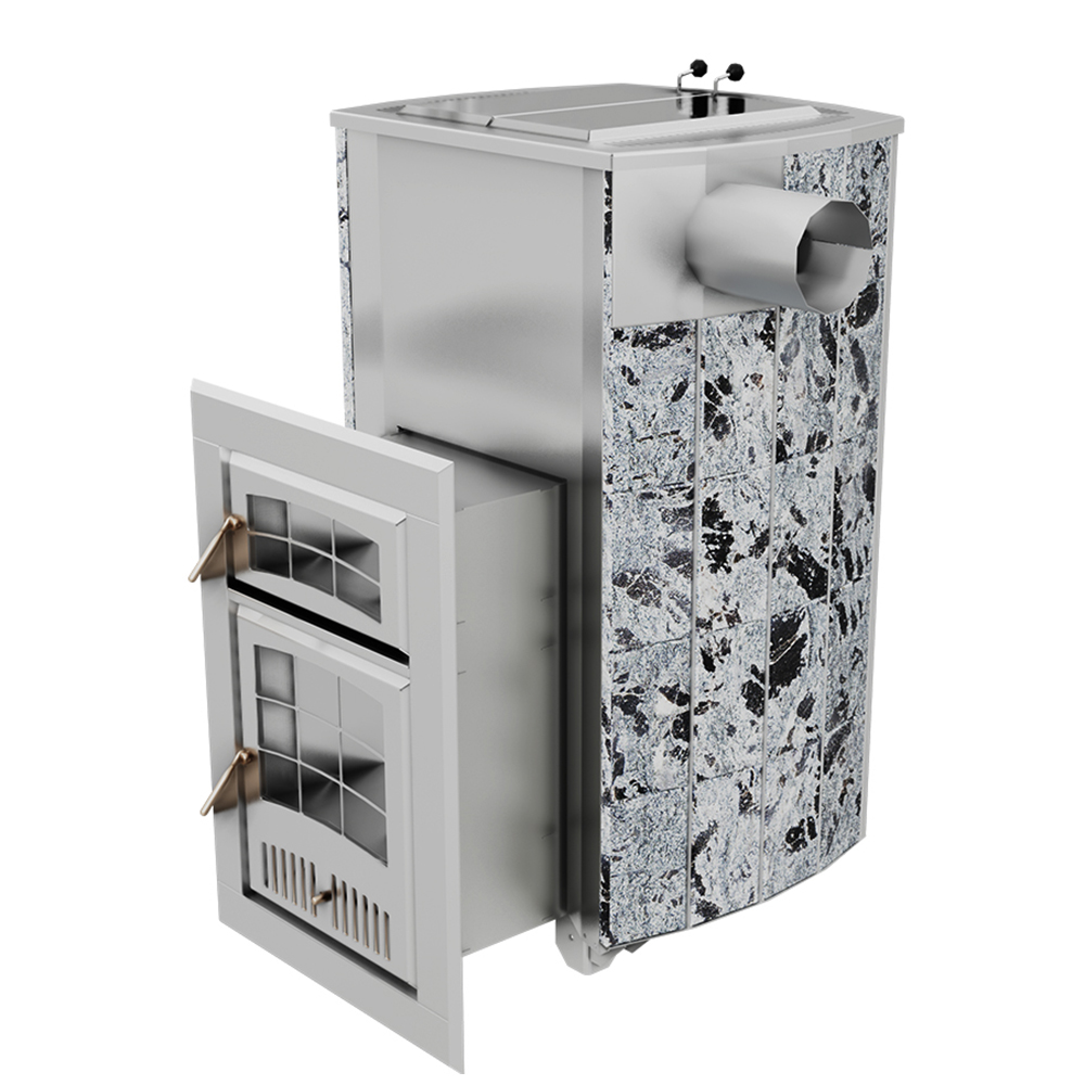 Внешний контур печи - массивная каменная облицовка, выполнена из природного камня серпентинита, талькохлорита или змеевика. Является одновременно и экраном от жесткого инфракрасного излучения, и стенкой конвекционного канала между нею и топочным агрегатом. Наличие этого канала сделало печь «быстрой» на изначальный разогрев парного помещения и всей бани в целом.