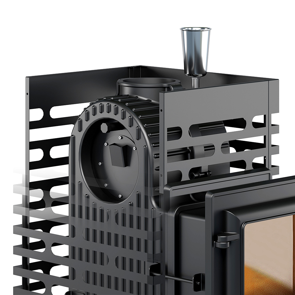 - Стальной кожух-конвектор значительно ускоряет нагревание воздуха в парилке за счет образуемого им мощного воздушного потока.