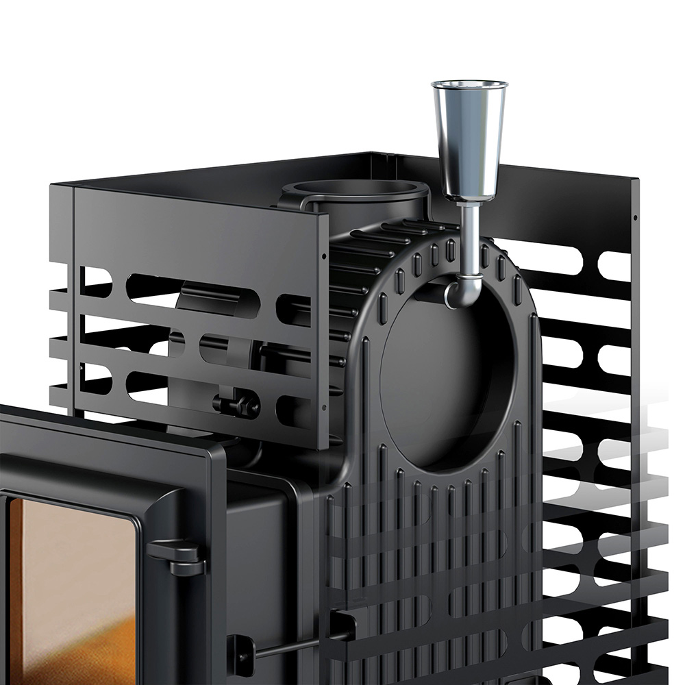 Банная печь Астон также оборудована стальным кожухом - конвекционной сеткой для камней, которая, за счет конвекционных потоков воздуха ускоряет процесс образования пара. Печь имеет закрытую каменку, которая для лучшего прогрева камней, прогревается открытым пламенем. Благодаря наличию парогенератора – вода попадает и равномерно распределяется среди максимально прогретых камней в закрытой каменке, таким образом образуется максимальное количество сухого, мелкодисперсного пара.