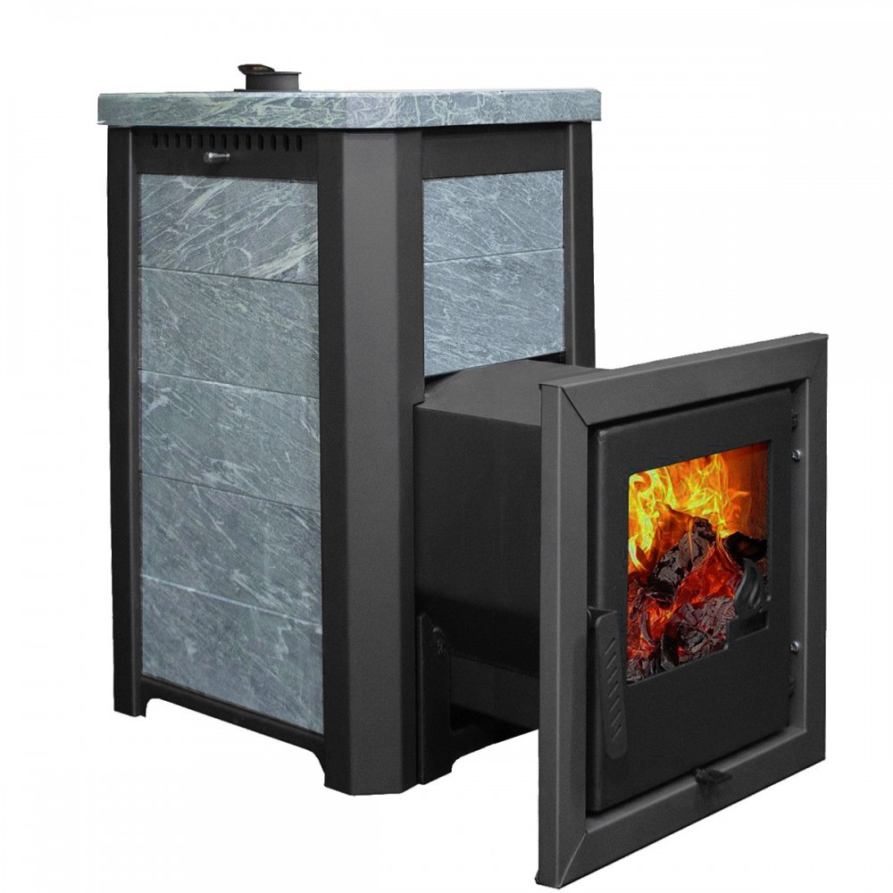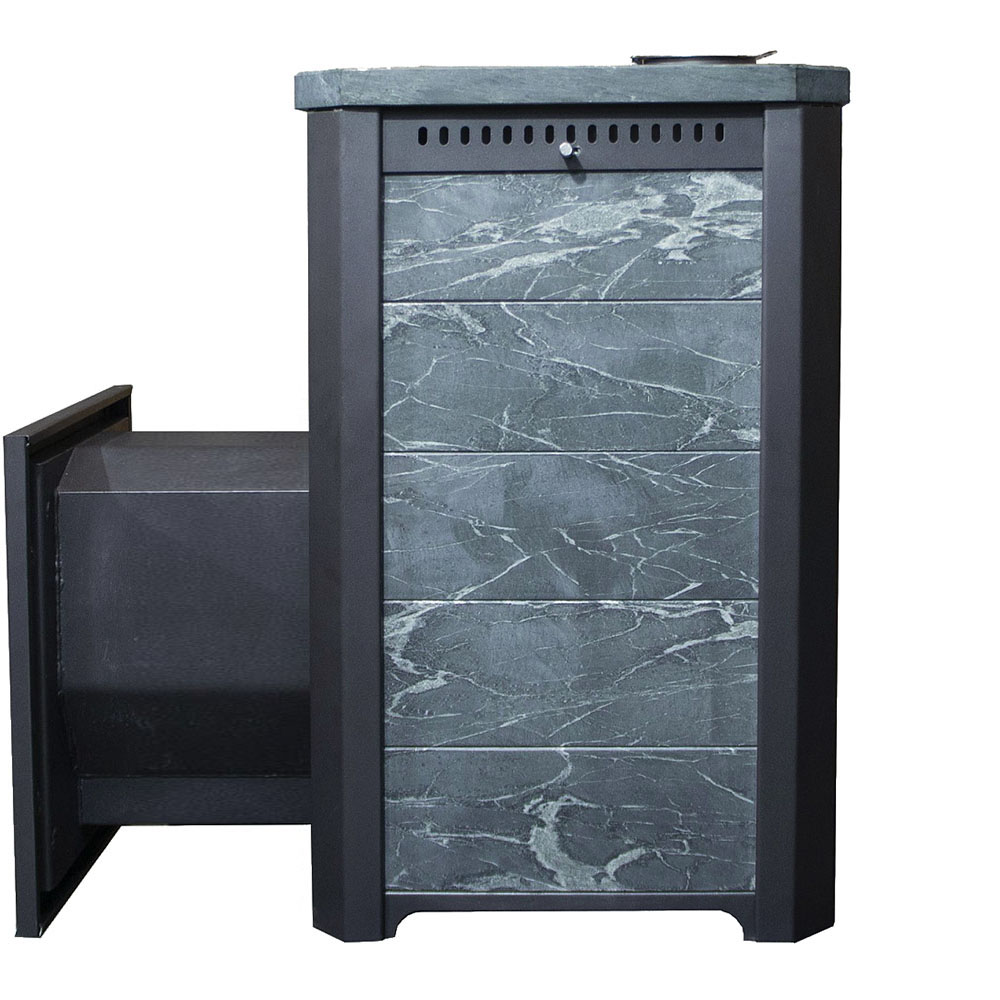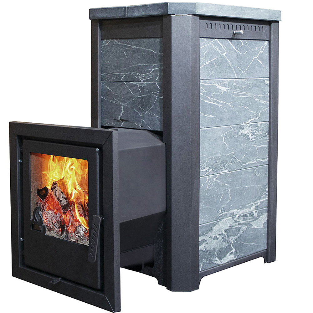 Облицовка камнем данной модели выравнивает тепловую волну, а также украшает помещение. За счет этих качеств в парном помещении получается мягкий микроклимат, что делает времяпрепровождение более приятным. Если в конвекционных моделях воздух в парной нагревается за счет воздушных потоков проходящих между корпусом печи и рубашкой, то в печах в облицовке сначала разогреваются каменный кожух, а затем уже воздух, поэтому печи такого типа требуют больше времени на протопку, но и держат тепло существенно дольше. Еще одним плюсом является отсутствие неприятного ИК излучения от раскаленного металла и уменьшенные пожаро-безопасные расстояния до деревянных конструкций.Время нагрева помещения (при условии правильной теплоизоляции) 60 - 90 мин.