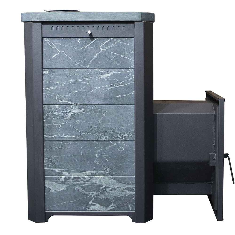 Стенки печи облицованны натуральным природным камнем талькохлорит, который аккумулирует тепло исходящее от печи и убирает неприятное излучение от металла.