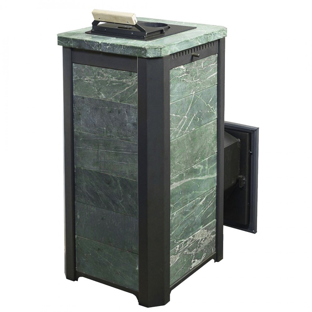 Обклад из природного теплоемкого камня талькохлорита или змеевика не позволяет сильно перегревать воздух в парной, а камни, закладываемые внутрь печи (около 70 кг), нагреваются сильнее чем в печах с открытой закладкой и на выходе получаем режим, приближенный к русской бане.Открыванием дверцы можно регулировать температуру в парной по своему желанию.