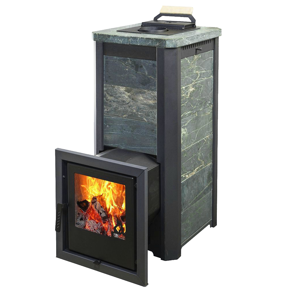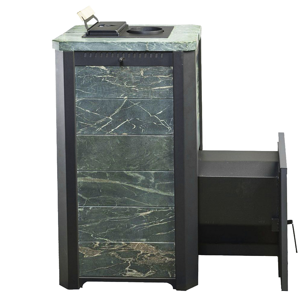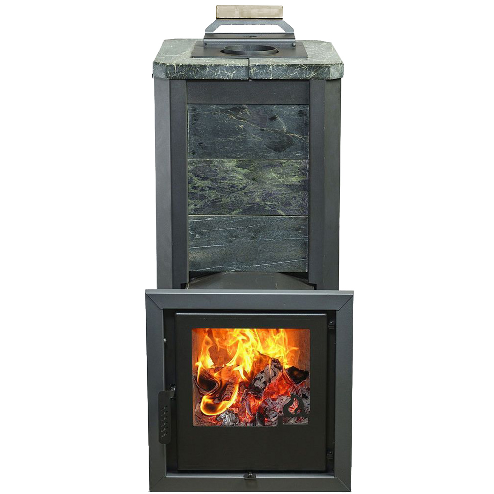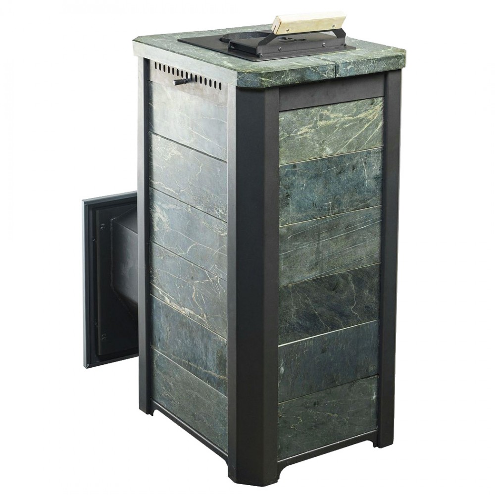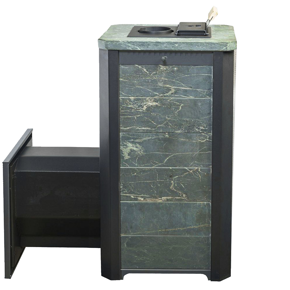 Облицовка камнем данной модели выравнивает тепловую волну, а также украшает помещение. За счет этих качеств в парном помещении получается мягкий микроклимат, что делает времяпрепровождение более приятным. Если в конвекционных моделях воздух в парной нагревается за счет воздушных потоков проходящих между корпусом печи и рубашкой, то в печах в облицовке сначала разогреваются каменный кожух, а затем уже воздух, поэтому печи такого типа требуют больше времени на протопку, но и держат тепло существенно дольше. Еще одним плюсом является отсутствие неприятного ИК излучения от раскаленного металла и уменьшенные пожаро-безопасные расстояния до деревянных конструкций.Время нагрева помещения (при условии правильной теплоизоляции) 60 - 90 мин.