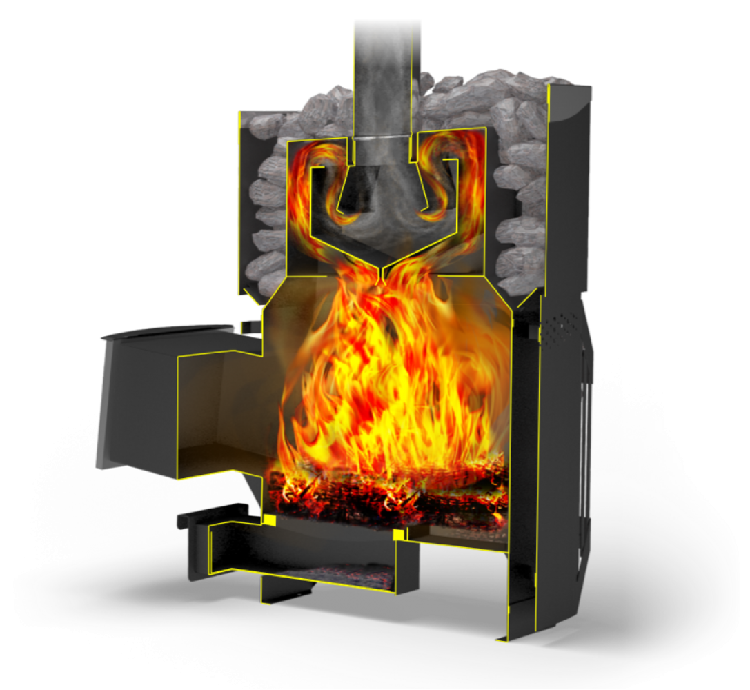 Кожух-конвектор экранирует жесткое инфракрасное излучение, исходящее от раскаленных стенок топки, что создает «мягкое» тепло в парилке.