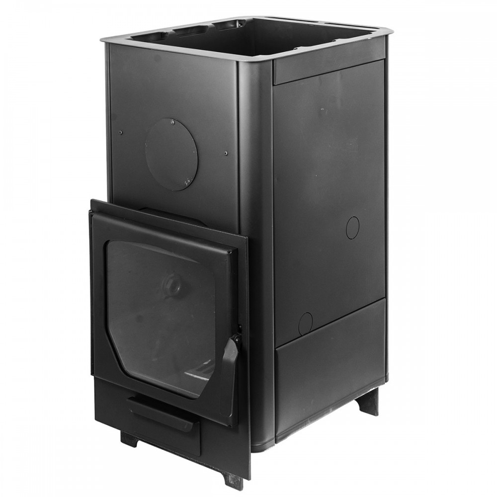 Печь "Мини" для парных с объемом от 5 до 12 куб. метров с конвекционным кожухом для закладки камнем с коротким топочным тоннелем (топится непосредственно в помещении парилки) и панорамным стеклом в дверце.