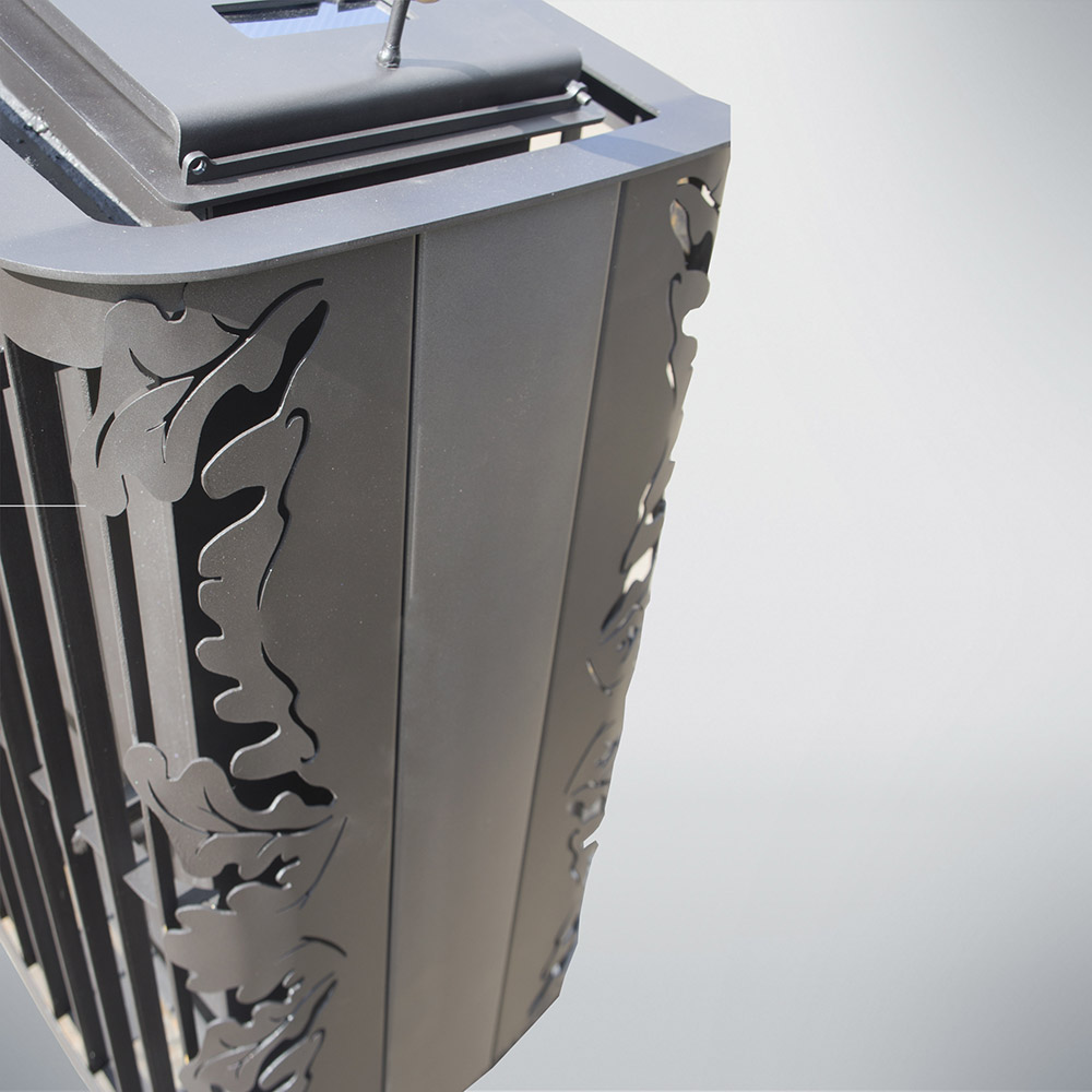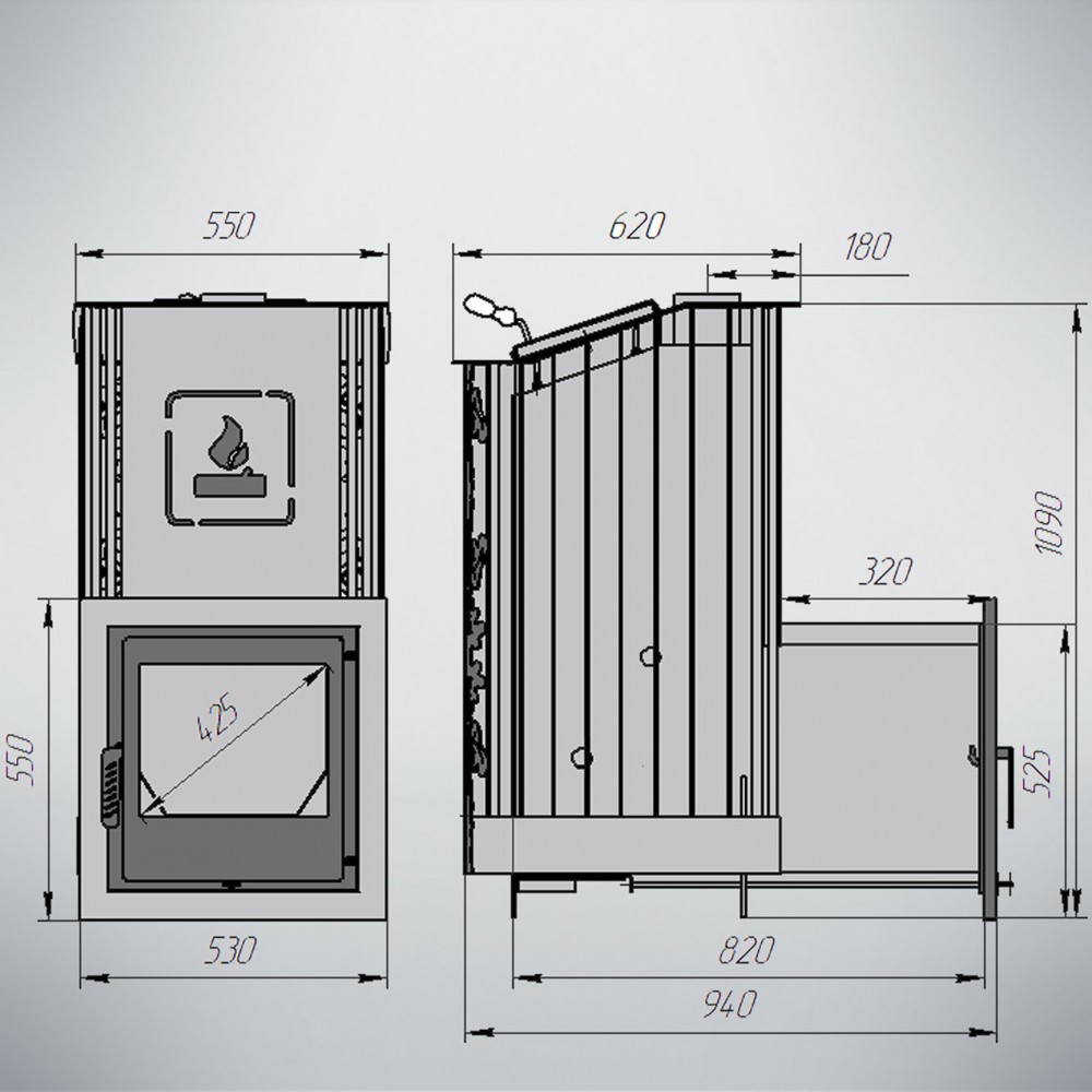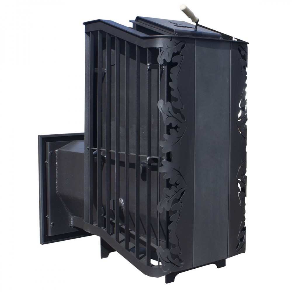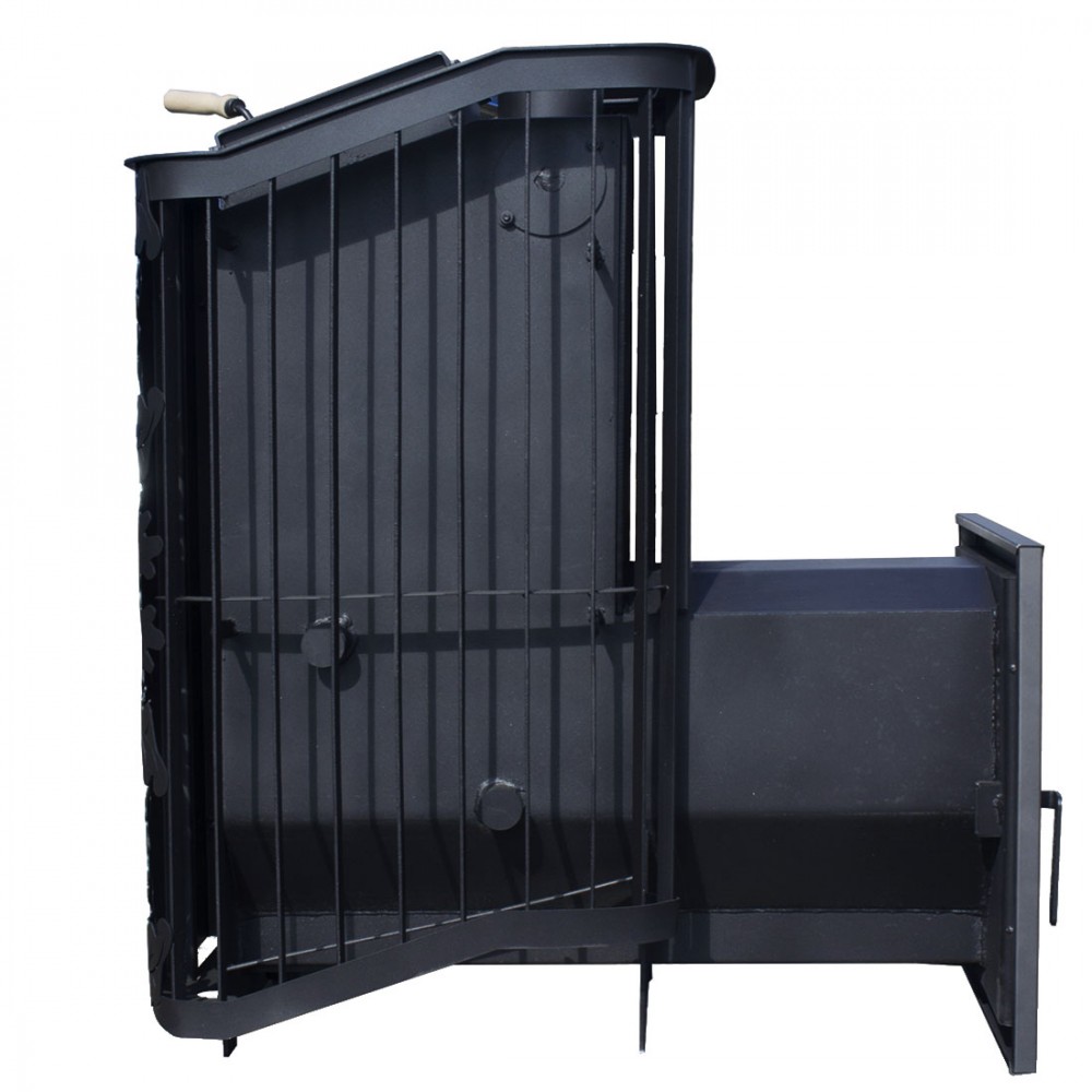Топка и зольный ящик изготовлены из стального проката, усиленные в участках подверженных наибольшей деформации гибкой. Рядом с отсеком для закладки камня находится патрубок для подключения дымохода.
