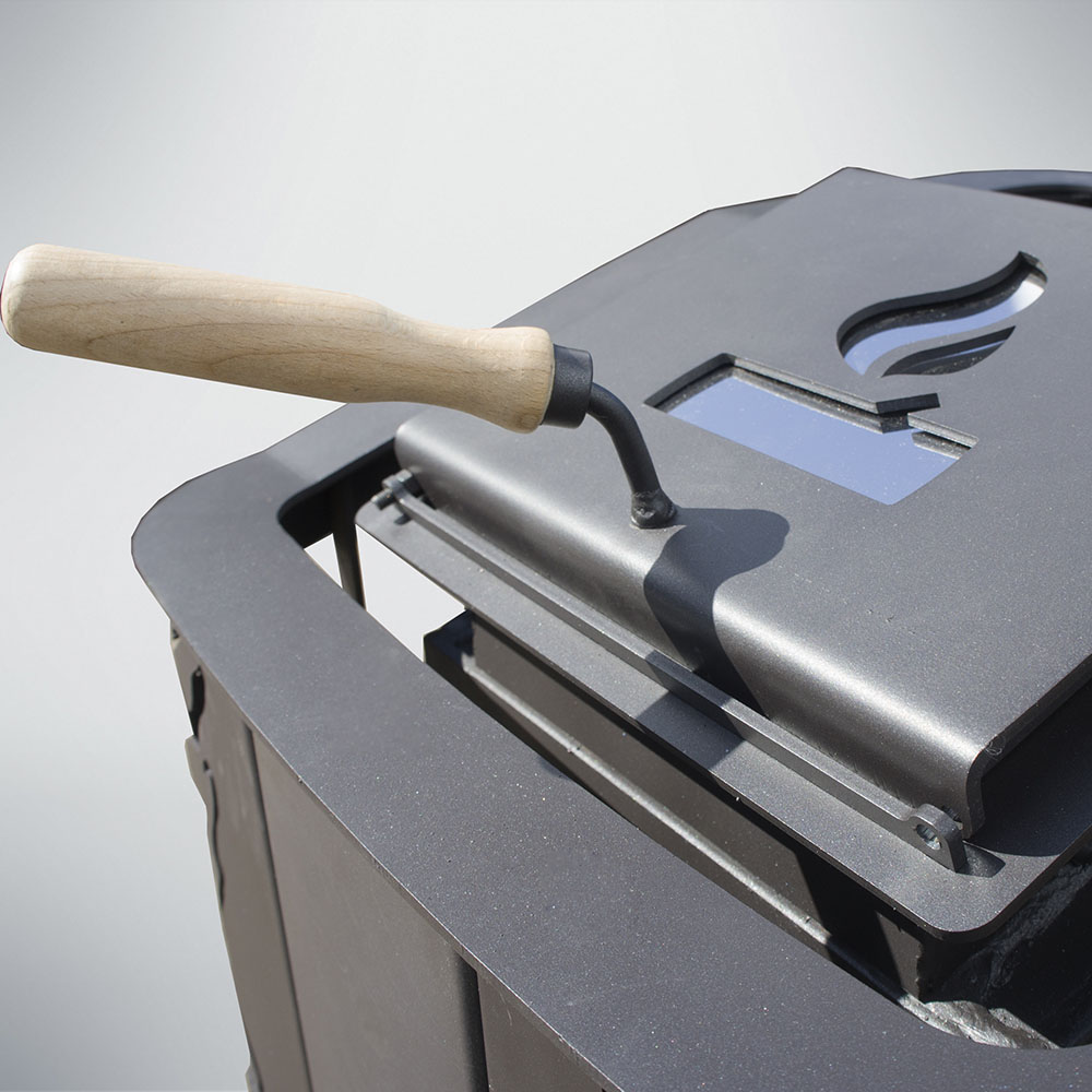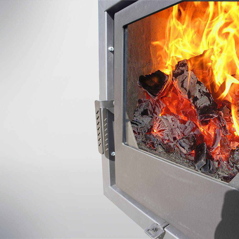 Дверь топки в базовой комплектации укомплектована стальной пластиной (заглушкой), которая в свою очередь в любой момент может быть заменена на стекло соответствующего размера.