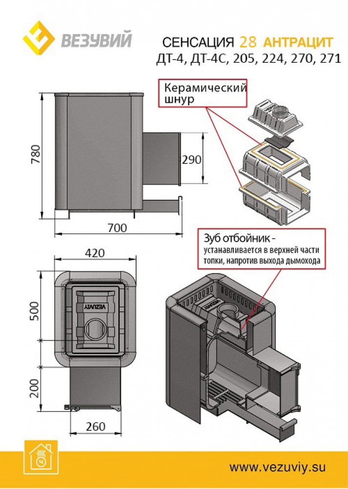 Преимущество печи «Сенсация» объемная, вентилируемая каменка позволяющая максимально быстро нагреть камни с четырёх сторон в кратчайшие сроки. Большая масса камней, закладываемая в каменку печи, нагревается до 350 °С, что позволяет обеспечить стабильность температуры в парилке и является мощным парогенератором. Поверхность нагрева печи охвачена сверхъемким наружным конвекционно-вентилируемым кожухом, что значительно ускоряет нагревание воздуха в парилке за счёт образуемого им мощного конвекционного потока. Банная чугунная печь Сенсация 22 (ДТ-4C) укомплектована чугунной герметичной дверцей Везувий ДТ-4C с жаропрочным стеклом «SCHOTT ROBAX». Топка печи состоит из 3-х чугунных элементов толщиной 12 мм. На стыке между ними используется керамический шнур с рабочей температурой 1200 градусов. То есть топка печи абсолютно герметична! Для фиксации деталей между собой применяется болтовое соединение, что даёт 100% гарантию безопасности при эксплуатации. Печи отлиты из специального сплава чугуна, которые выдерживают максимальные температурные перепады, т.е. даже при попадании большого количества воды чугунная печь сохраняет свою исключительную целостность и не лопается в отличие от изделий других производителей.