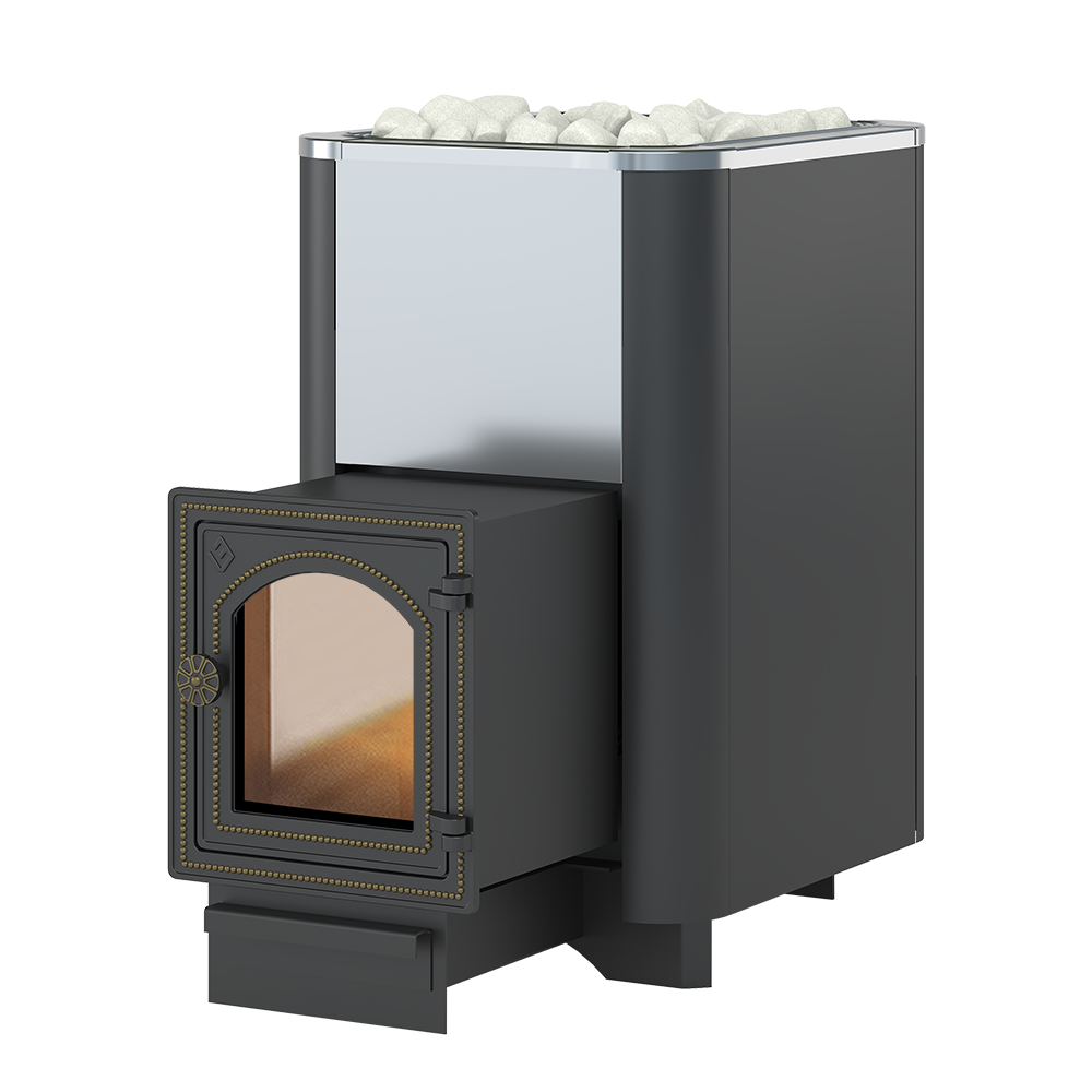 В конструкции данной печи предусмотрен топочный тоннель длиной 200 мм, при помощи которого печь топится из соседнего помещения, смежного с парильным. Для этих печей довольно часто используют бак для воды и монтируют его либо на дымоход, либо через теплообменник (регистр) в моечную.