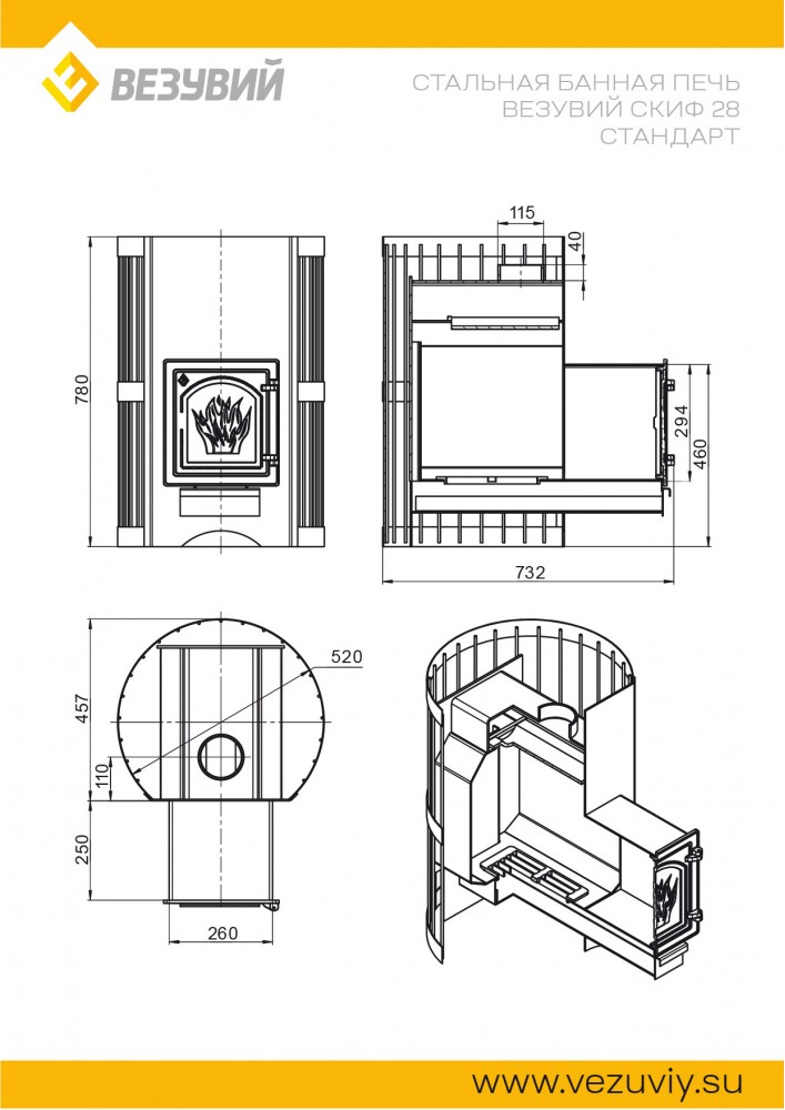 | Комплект поставки | печь банная торговой марки «Везувий»; колосниковая решётка; пламегаситель (в зависимости от модели); топочная дверь; зольный ящик; инструкция по монтажу и эксплуатации |