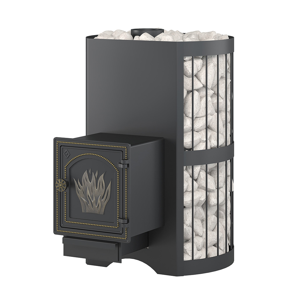 Чугунный пламегаситель перенаправляет поток горячего воздуха и дымовых газов к задней части топки. Это позволяет снять с печи максимум энергии в единицу времени. Чугунная дверь при нагревании не деформируется, сохраняет свою форму при остывании и предотвращает попадание продуктов горения на пол перед топкой. Печи Везувий СКИФ оснащаются сетками для камней. Сетки могут быть сделаны из металлического прутка или кованой стальной ленты шириной 40 мм. В сетки по всей высоте укладываются камни для бани, обеспечивая большой объём заклада и длительное удержание тепла после прогрева каменки.