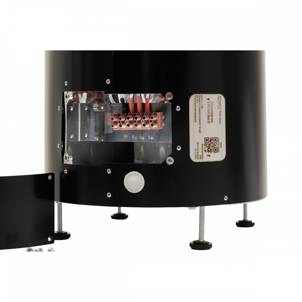 Эту электрическую печь можно установить как на пол, так и встроить в полок без лишних креплений благодаря специальному фланцу (приобретается отдельно). Такое решение позволяет сэкономить пространство и сделать дизайн парной эргономичным. Кроме того, специальный лючок в нижней части печи обеспечивает легкий доступ к клеммной колодке для подключения. Также предусмотрено специальное отверстие для подвода воды и подключения системы автоматической подачи пара SteamBoost.