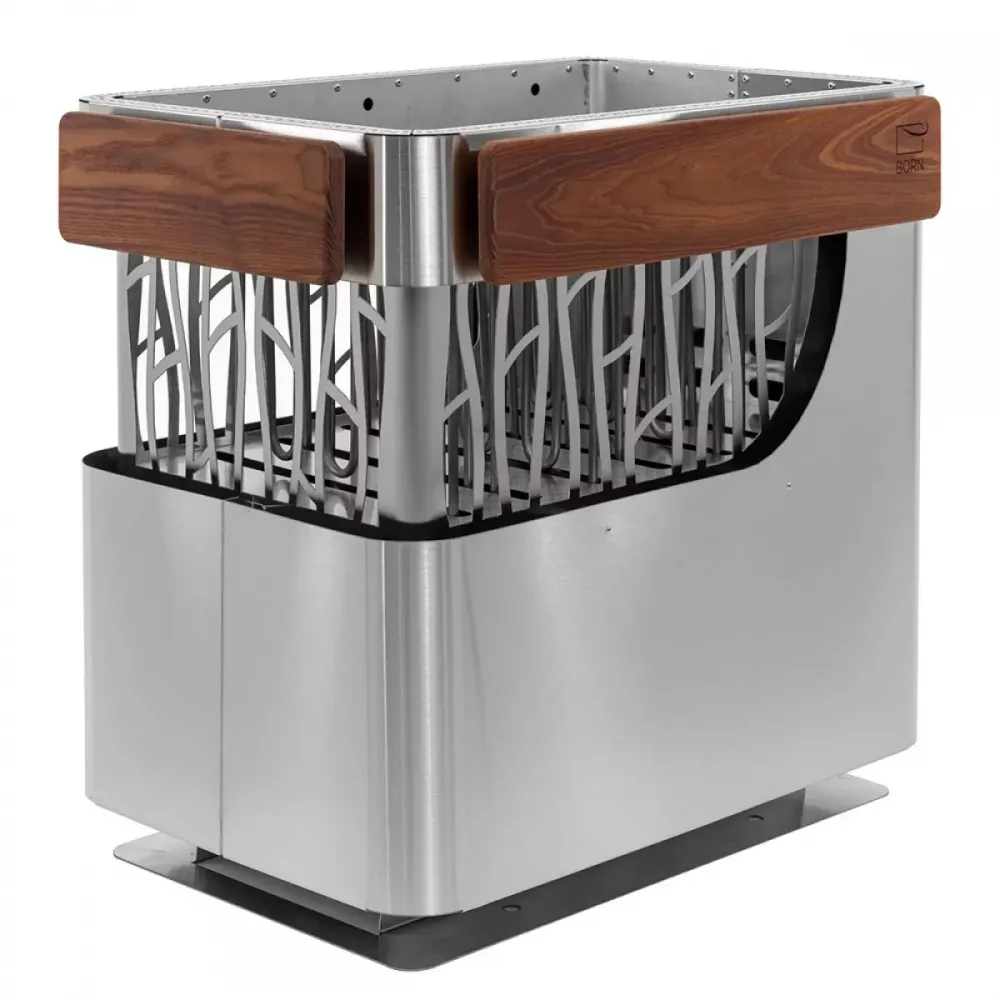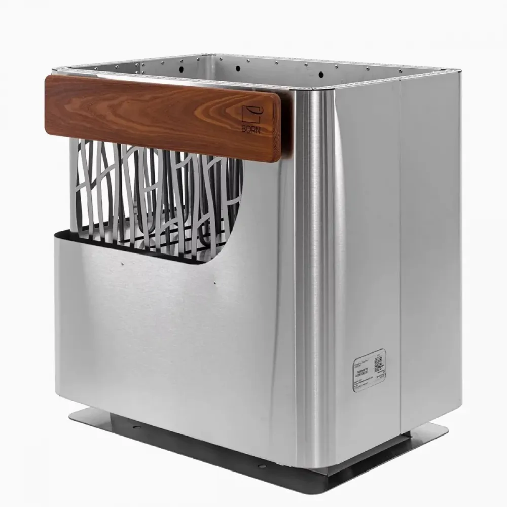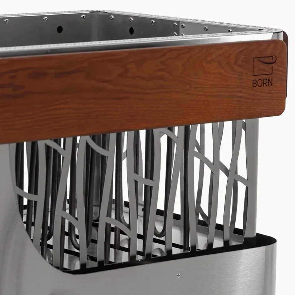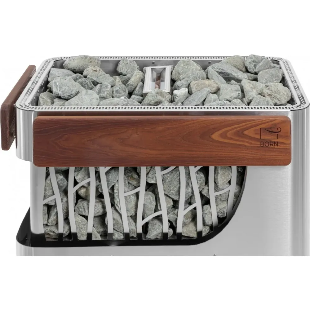 Несмотря на высокую технологичность и функциональность каменки, мы не хотели придавать ей футуристичный вид. Напротив, в дизайне BORN® STONE мы использовали максимально природные элементы: утонченный узор на корпусе, похожий на бегущие дорожки дождя по стеклу, и специальные деревянные вставки из термоясеня, которые не только практичны, но и создают приятный контраст, подчеркивая благородное сияние металла.