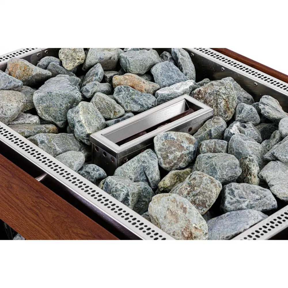 Мощный и быстрый нагрев обеспечивают 6 ТЭНов. Температура в помещении достигает заданной цифры на 40% быстрее, чем при использовании аналогичных моделей. А благодаря внушительной вместимости камней – до 100 кг – вы получите много мягкого, не обжигающего пара, который моментально заполнит парную.