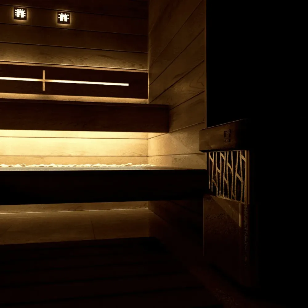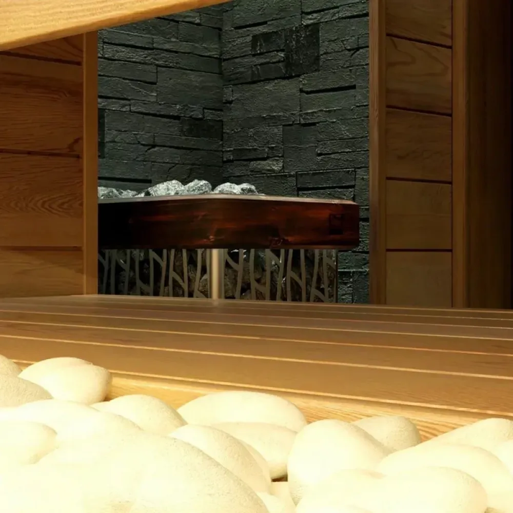 Встроенное ограждение из термоясеня по периметру печи защищает от случайных ожогов, а специальный защитный козырек для ТЭНов предотвращает попадание воды на контактную группу, обеспечивая безопасную эксплуатацию.