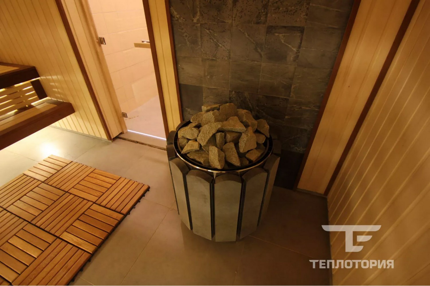 Для парообразования, специальное отделение – «каменка» заполняется камнями (нефрит, жадеит, талькохлорит) или чугунными ядрами, на выбор.
