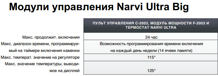 Для печи Narvi Ultra Big имеется отдельный пульт управления с функцией недельного прорграммирования работы каменки. Заданная температура воздуха в парильном помещении поддерживается с помощью специального термостата.