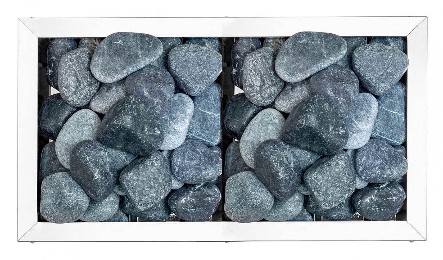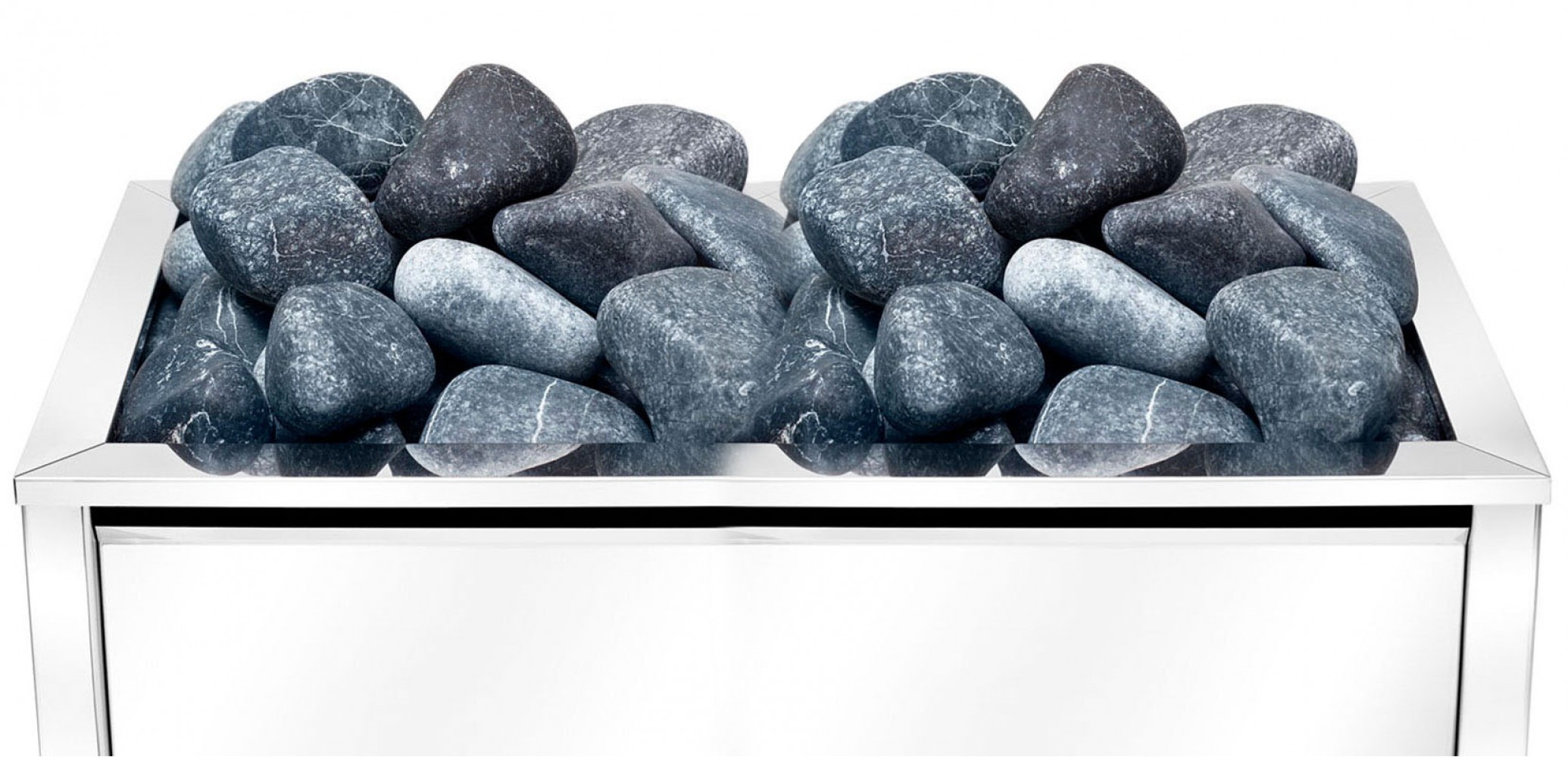 Представленная модель электрокаменки имеет отсек для камней, который вмещает до 50 кг. Она монтируется напольно.