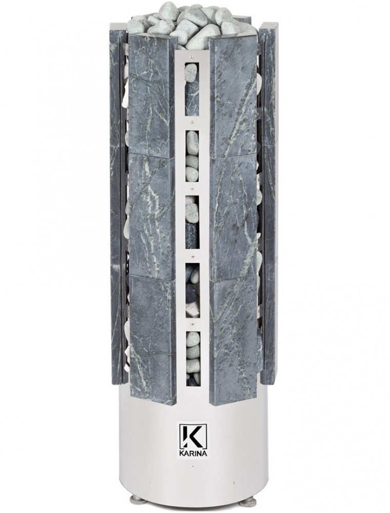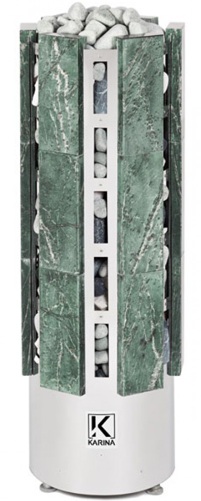 Электрическая печь KARINA Forta 21 обладает оригинальным дизайном и элегантным внешним видом, что позволяет ей вписаться в помещение любой сауны. Натуральный камень, которым облицован цилиндрический корпус электрокаменки, похож на мрамор, благодаря этому каменка будет шикарно смотреться в интерьере. А целебные свойства минерала позволяют отнести печь к оздоровельной серии. Мощность печи составляет 21 кВт, и она подходит для коммерческих бань и саун объемом до 38 куб. м. Модель имеет отсек для камней объемом до 120 кг.
