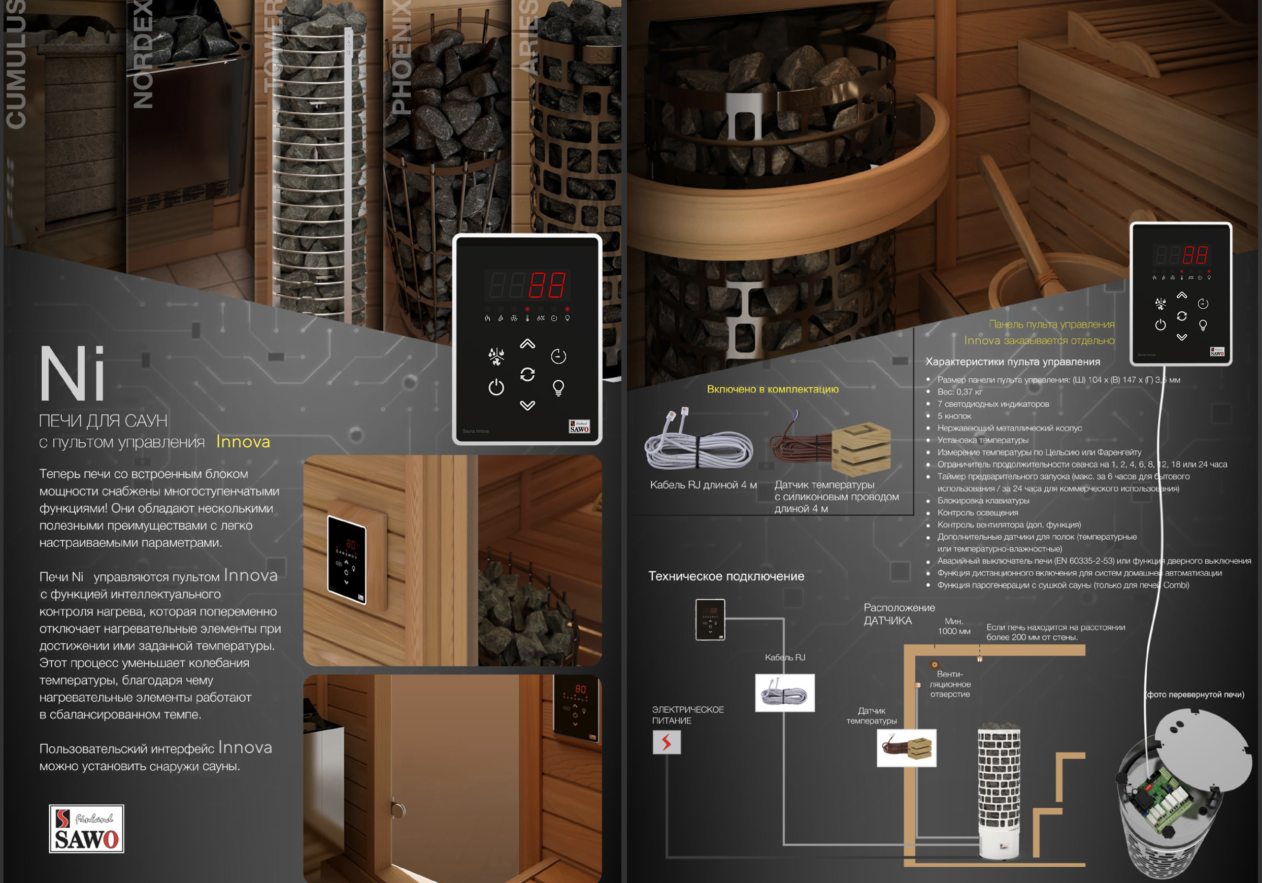 Управление данной моделью производится с помощью удобного выносного сенсорного пульта управления Innova с интуитивно понятным интерфейсом. Он позволяет запрограммировать режим работы электрокаменки заранее, а также вносить необходимые корректировки непосредственно во время процедуры парения. Современная панель управления SAWO с цифровым дисплеем может быть встроена в стену или установлена с отдельной монтажной рамой. Печь и Innova - это энергосберегающая пара, поскольку они обеспечивают равномерное распределение мощности, поддерживая только часть резисторов при достижении заданной температуры. Благодаря этой функции тэны равномерно нагружены и имеют более длительный срок службы. Температура может быть отрегулирована с точностью до одного градуса с помощью панели управления.