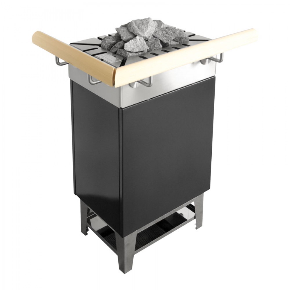 Напольная электрокаменка от немецкой компании Ewald Lang. Если в электрокаменках вы больше всего цените надежность то Lang — это оптимальный вариант. Все инженерные решения в этой печи рассчитаны на увеличение надежности. Подойдет для частной и небольшой общественной сауны. Стандартная печь Тип 33 вмещает 12 килограмм камней, а печь Тип 33 GSK 20 килограмм. Корпус покрыт черной жаростойкой эмалью, а верхняя часть выполнена из матовой нержавеющей стали. Возможно изготовить эту печь под заказ с корпусом без покраски из хромированной стали, а также добавить поручни по бокам и защиту кабеля.
