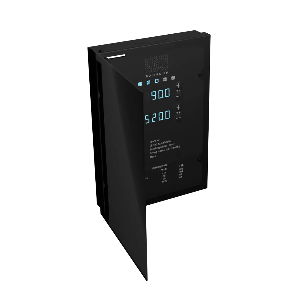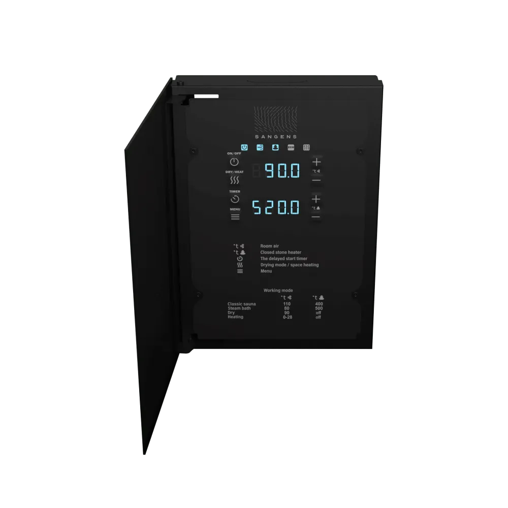 Блок управления дает возможность дистанционно управлять печью и микроклиматом в парной по каналу Wi-Fi и Bluetooth с помощью мобильного приложения Sangens App.
