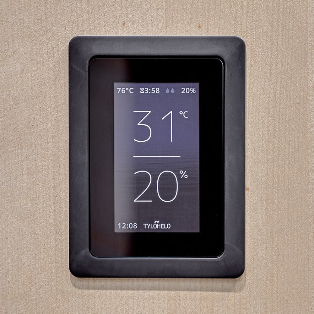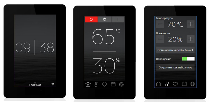 Сочетание элегантности, простоты и богатого функционала. Может управлять печью или парогенератором, а также сопутствующим оборудованием. Например: освещением или вентиляцией. Важное достоинство пульта — подключение к домашней сети Wi-Fi и дистанционный контроль во внутренней сети с помощью смартфона или компьютера.
