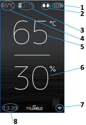 ![]() 1. Настройка влажности воздуха 2. Уровень воды в баке (для модели Combi) 3. Оставшееся время сеанса 4. Настройка температуры 5. Текущая температура 6. Текущая относительная влажность воздуха (отображается на моделях Combi и Tylarium, только если подключен датчик температуры/влажности) 7. Соединение Wi-Fi 8. Текущее время |