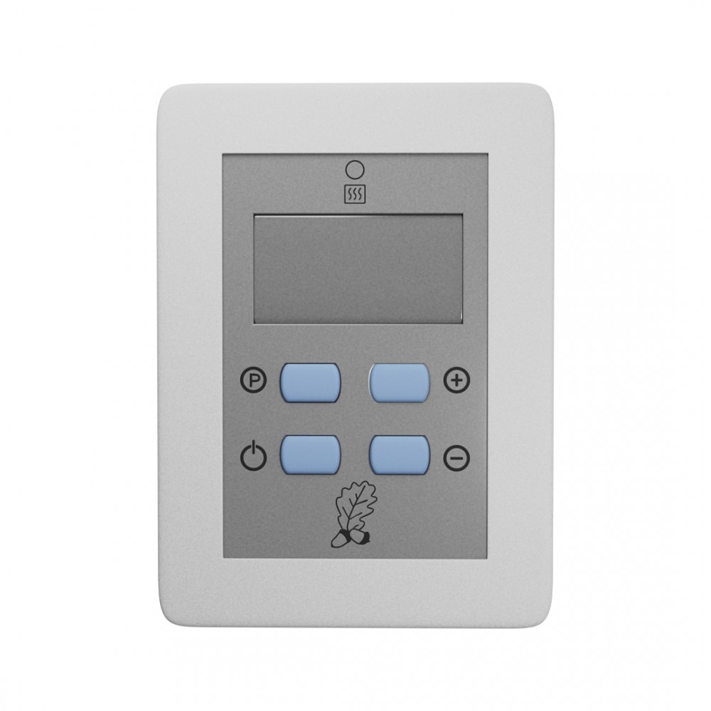 Электронный терморегулятор позволяет поддерживать заданную температуру, снабжен таймером времени и информационным табло, показывающим текущую температуру. В данной модели предусмотрено только включение и выключение тэна парогенератора, без регулировки его мощности.Универсальные пульты управления серии ПУ, в комплект которых входят