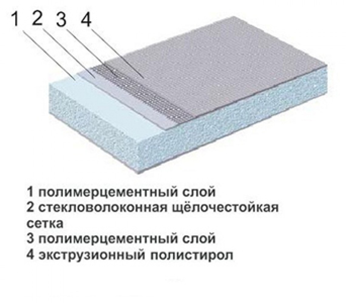 Теплоизоляционные панели TEPLOFOM+ имеют довольно сложную конструкцию. Лист экструдированного полистирола покрывается слоем полимерцемента. Затем панель армируется выполненной из стекловолокна сеткой. Полимерцементный слой делает поверхность листа более гладкой.
